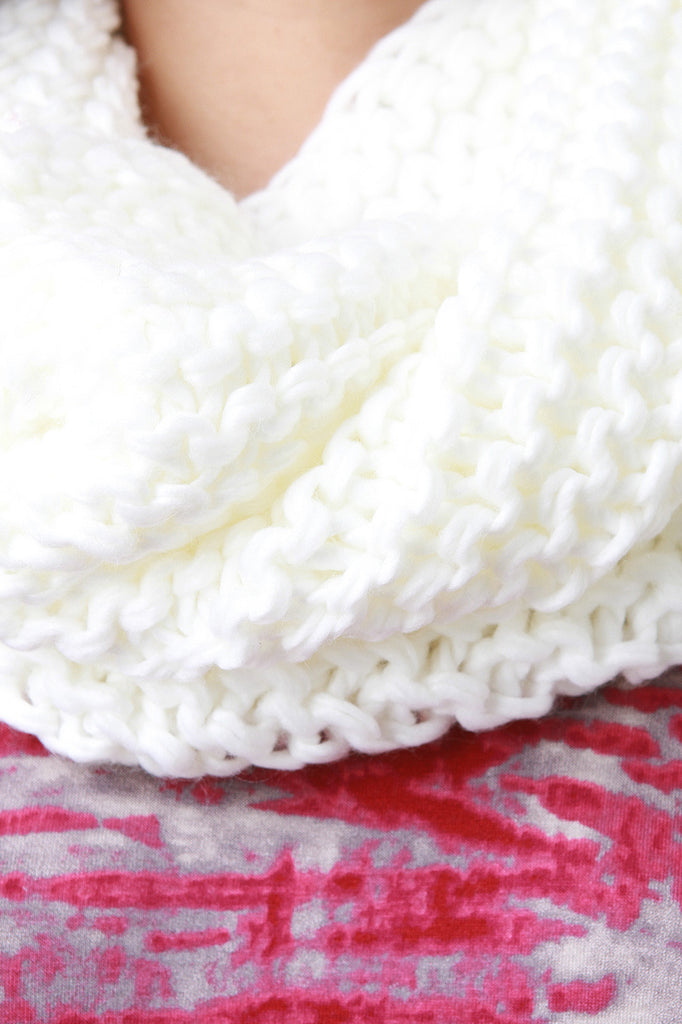 This infinity scarf features a loose-knit, solid coloring, and a long construction. 100% Acrylic.