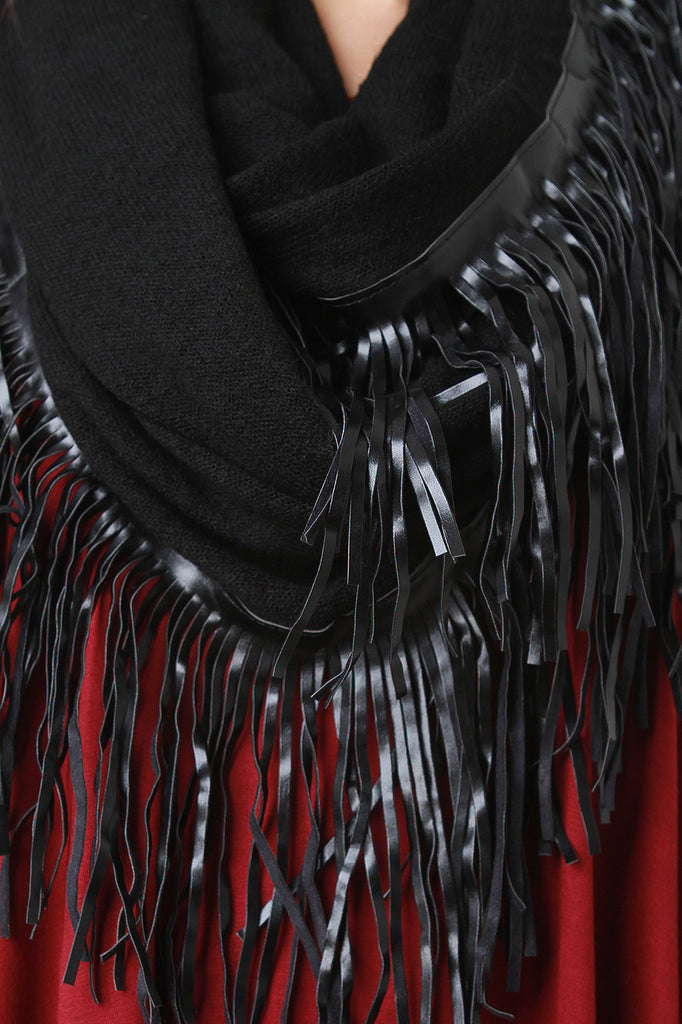 A fine knit infinity scarf with vegan leather fringe trim on one edge.