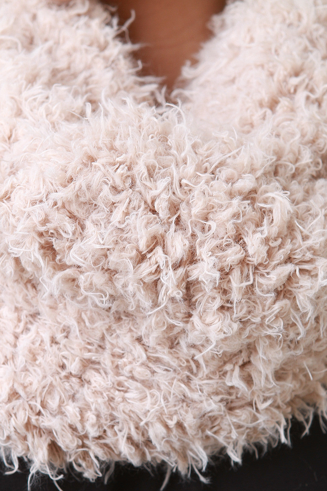 A twisted mobius infinity scarf in soft faux shearling. 100% Acrylic.