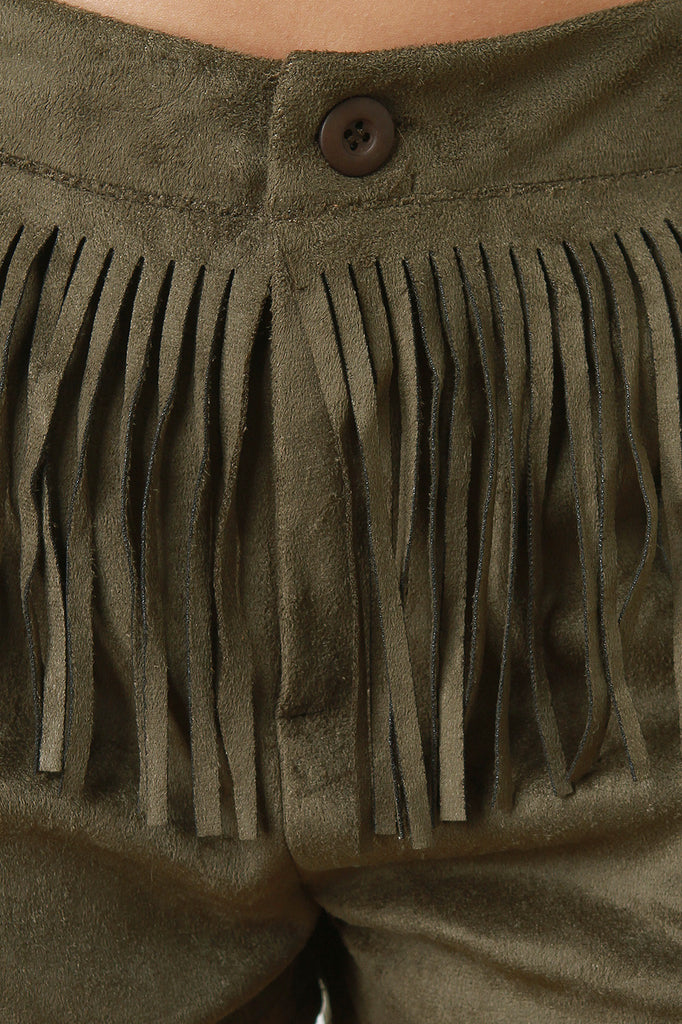 Faux fringe detail, zip fly, and single button closure. Accessories sold separately. 100% Polyester.