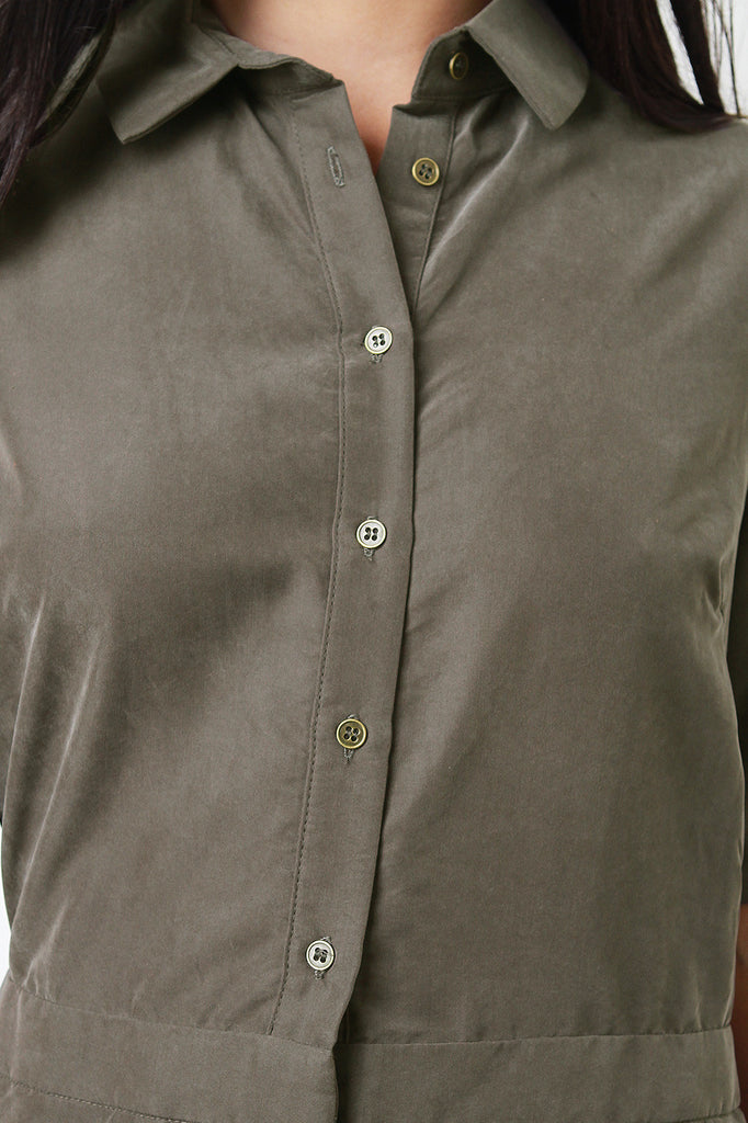 This chic jumpsuit features a button-up front to a classic collar neckline, short sleeves, cinched panel at waist, zipper fly, hook secure closure, Bermuda cut shorts, side pockets, and crisscross back with a keyhole opening. Accessories sold separately. 72% Modal, 28% Polyester.