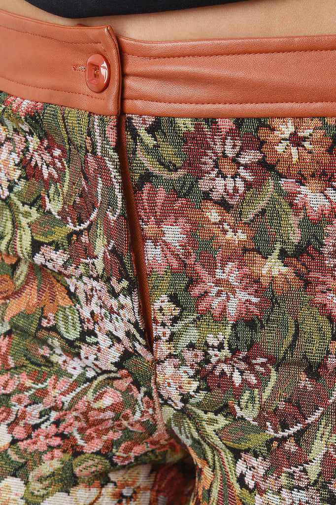 These floral tapestry main, vegan leather panels at sides, and single button closure with zip fly. Accessories sold separately. 80% Polyester, 20% Cotton.