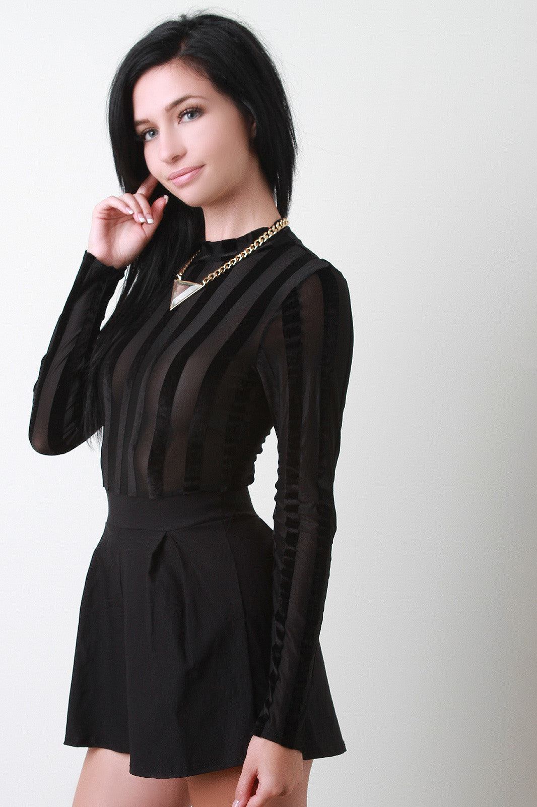 This combo romper features a mock neckline, long sleeves, semi-sheer mesh upper with velveteen vertical stripes, wide cinched waist seam, pleated construction, shorts bottom, and zipper fastener at back. Accessories sold separately. Made in U.S.A. 95% Polyester, 5% Spandex.