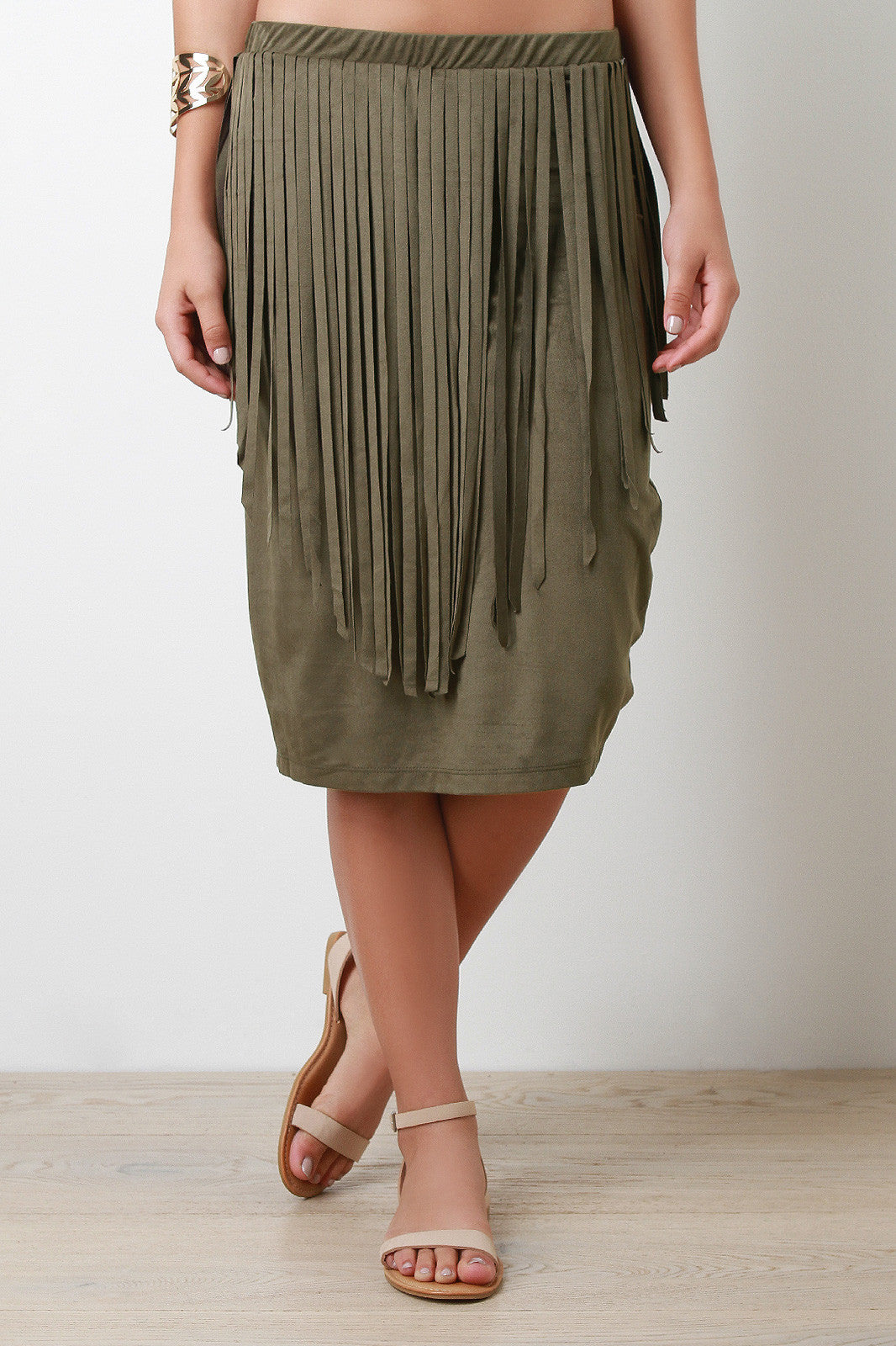 This vegan suede skirt features an elasticized waist, long cascading fringe top tier, and knee length skirt. Accessories sold separately. Made in U.S.A. 90% Polyester, 10% Spandex.