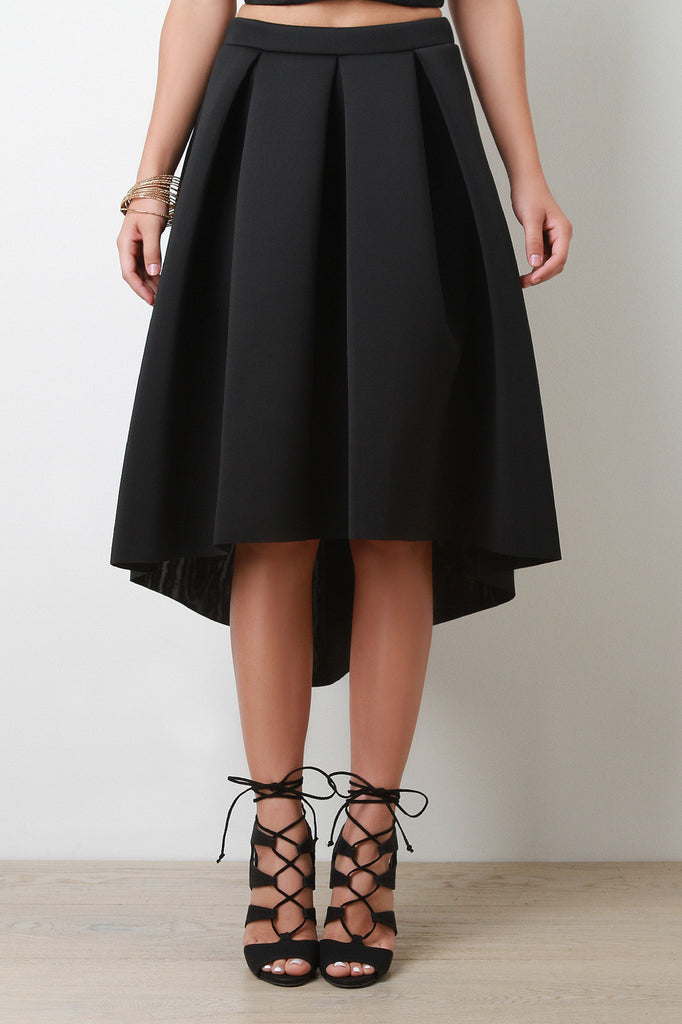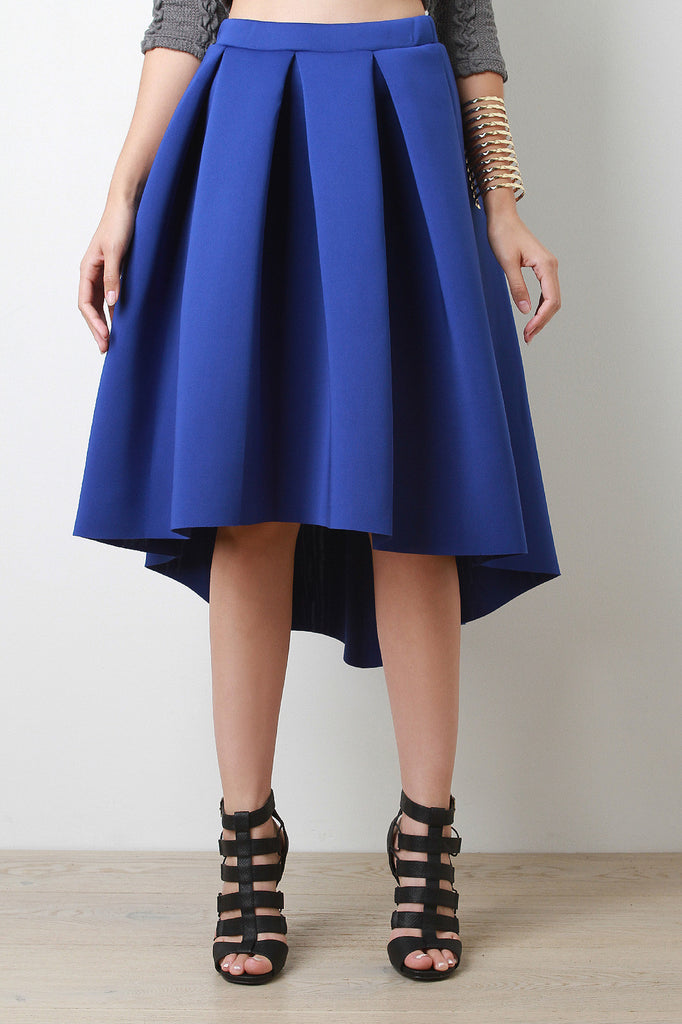 This midi skirt features scuba knit, pleated design, and high-low hemline. Accessories sold separately. Made in U.S.A. 95% Polyester, 5% Spandex.