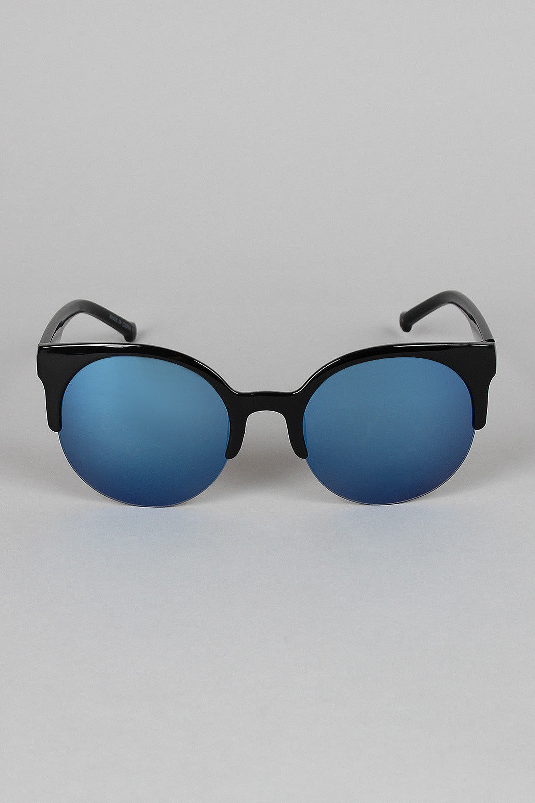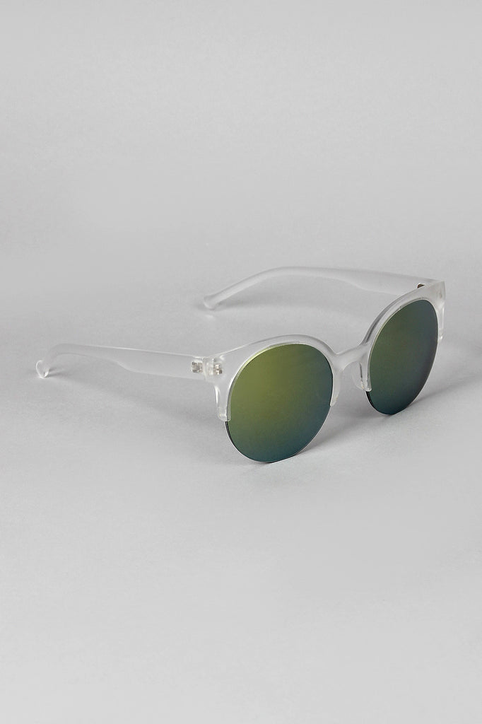 These round shape sunglasses feature a thick plastic brow, rimless bottom, and colorful reflective lenses. Arms end in a unique round shape.
