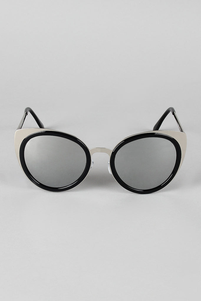 Cat eye shape sunglasses with glossy metallic frame, rounded plastic edge design, and reflective lenses.