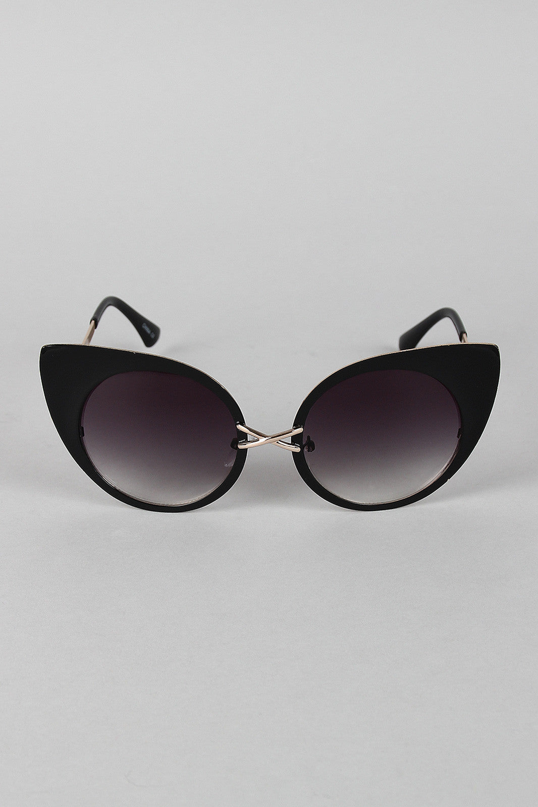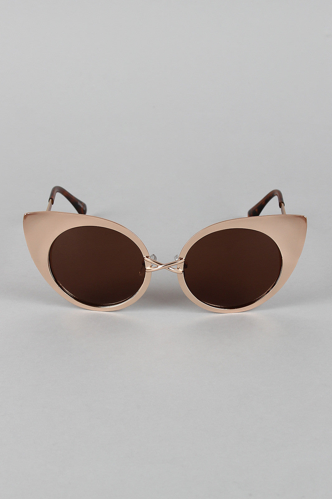 These metallic frame sunglasses feature a crossed nose bridge, round lens, and a pointy cat eye look with slightly curved-inward tips. Finished with thick temple bars and long temple tips.