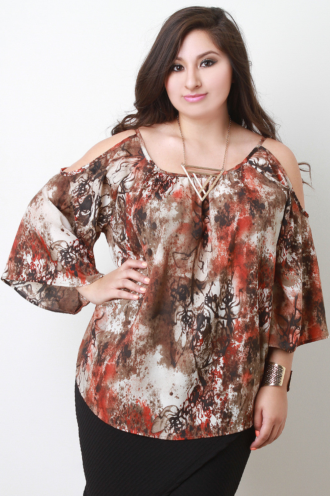 This plus size top features abstract print on lightweight fabric, scoop neckline, open shoulders, and wide sleeves. Accessories sold separately. Made in U.S.A. 100% Polyester.