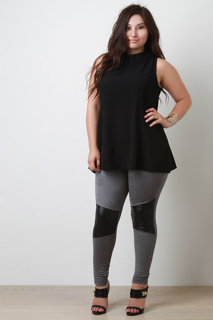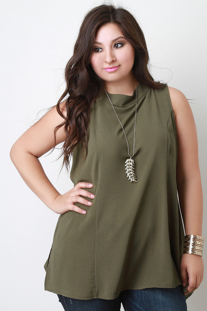 This plus size chiffon top is trapeze silhouette with princess seams. Designed with a slight mock-neck and two button-and-loop closures on the back; featuring, a keyhole opening. Finished with two small side slits. Accessories sold separately. 100% Polyester.