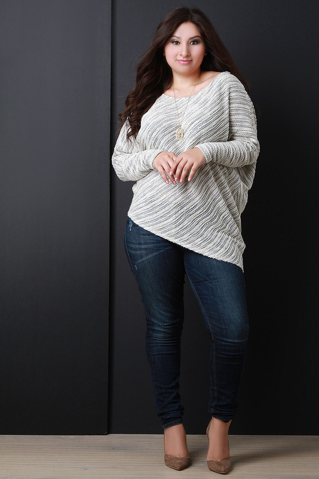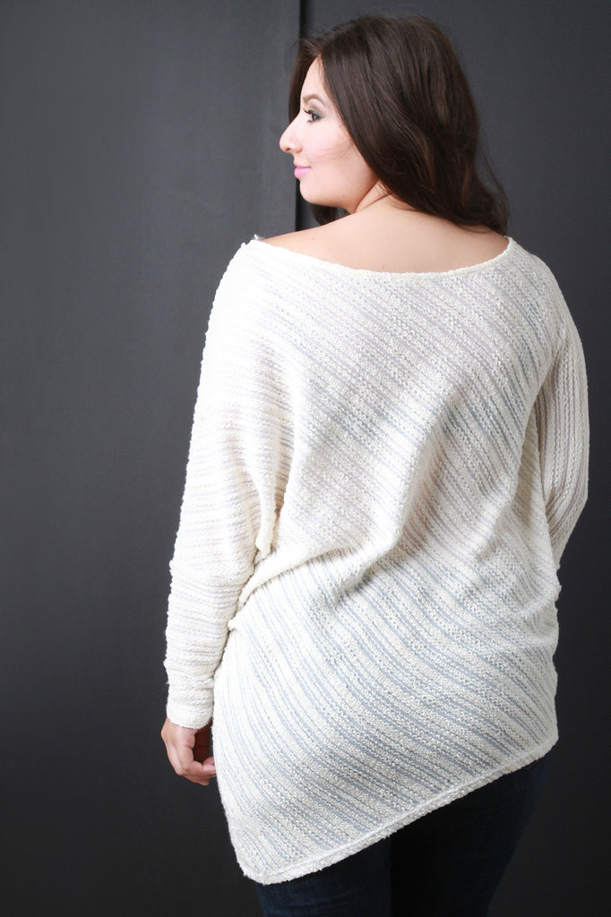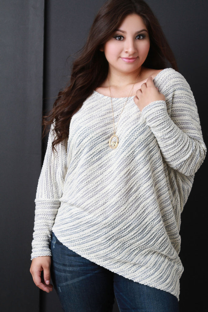A plus size semi-sheer crochet sweater top featuring a wide round neckline, dropped shoulders with long dolman sleeves, and a slanted hemline. Unlined. Accessories sold separately. Made in U.S.A. 56% Polyester, 44% Cotton.