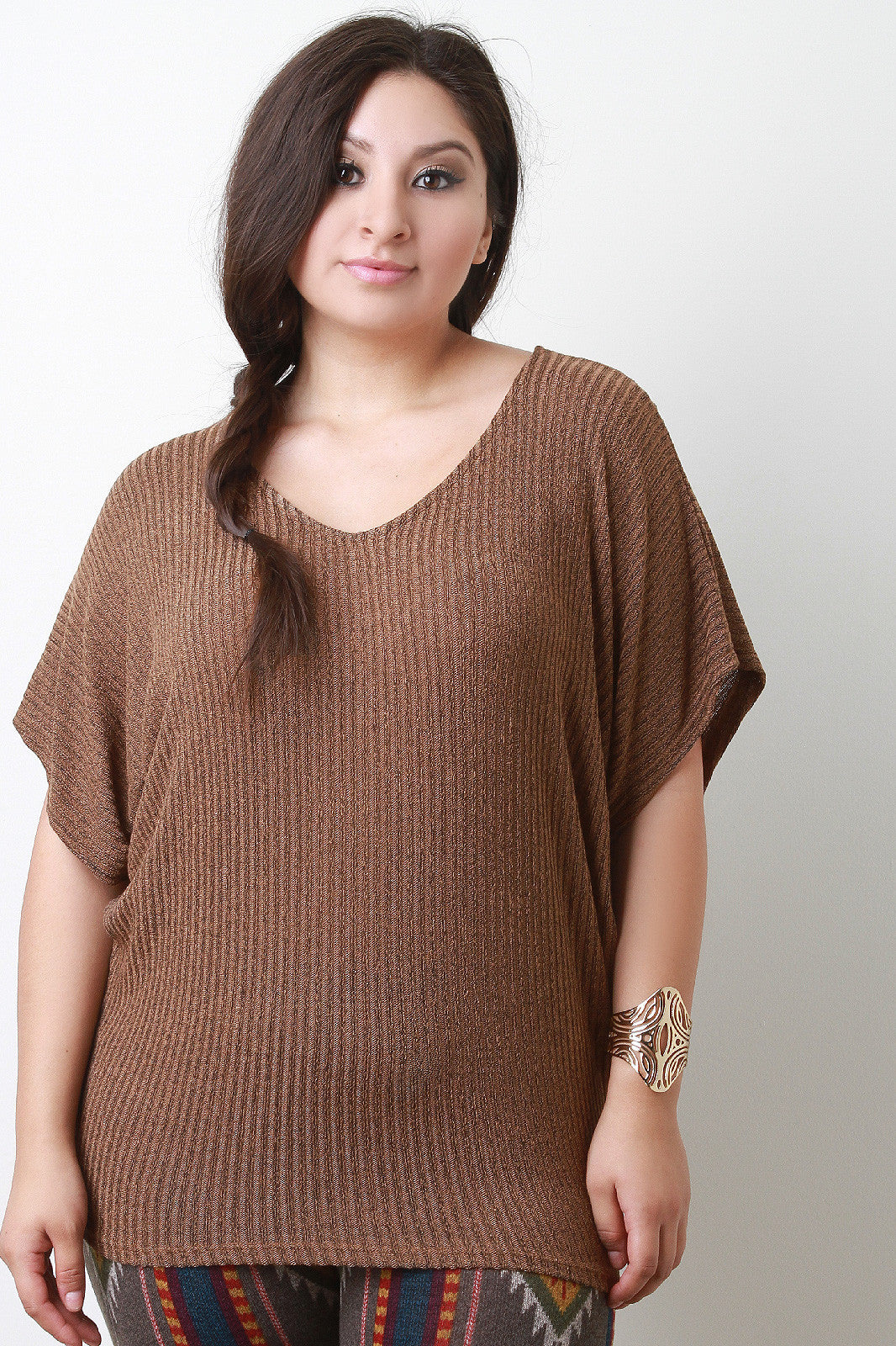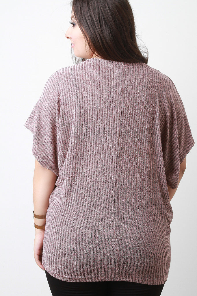 This marled knit plus size top features vertical ribbed knit design, short sleeves, and casual fit. Accessories sold separately. Made in U.S.A. 17.5% Polyester, 79.5% Rayon, 3% Spandex.