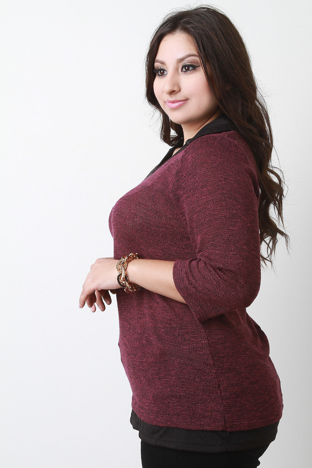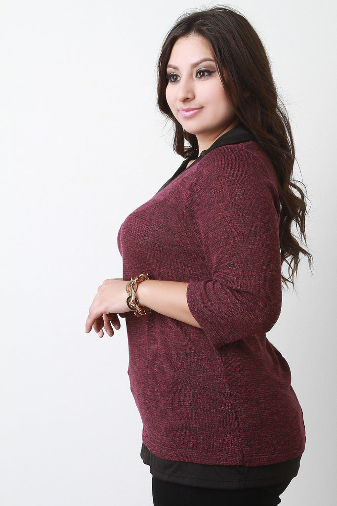 This trendy plus size marled top features a v neckline with contrast color design, quarter sleeves, and finished with layered style hemline. Accessories sold separately. Made in U.S.A. Self: 87% Polyester, 10% Rayon, 3% Spandex. Contrast: 87% Polyester, 10% Rayon, 3% Spandex.