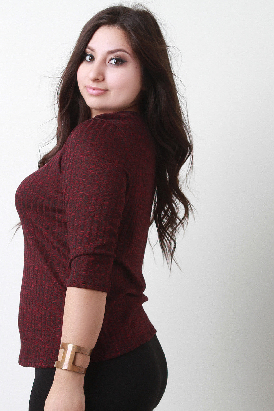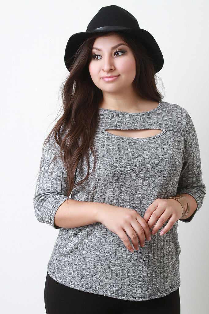 This plus size top features a ribbed knit fabrication with front cutout detail, round neckline, quarter sleeves, and straight hemline. Accessories sold separately. Made in U.S.A. 58% Rayon, 38% Polyester, 4% Spandex.