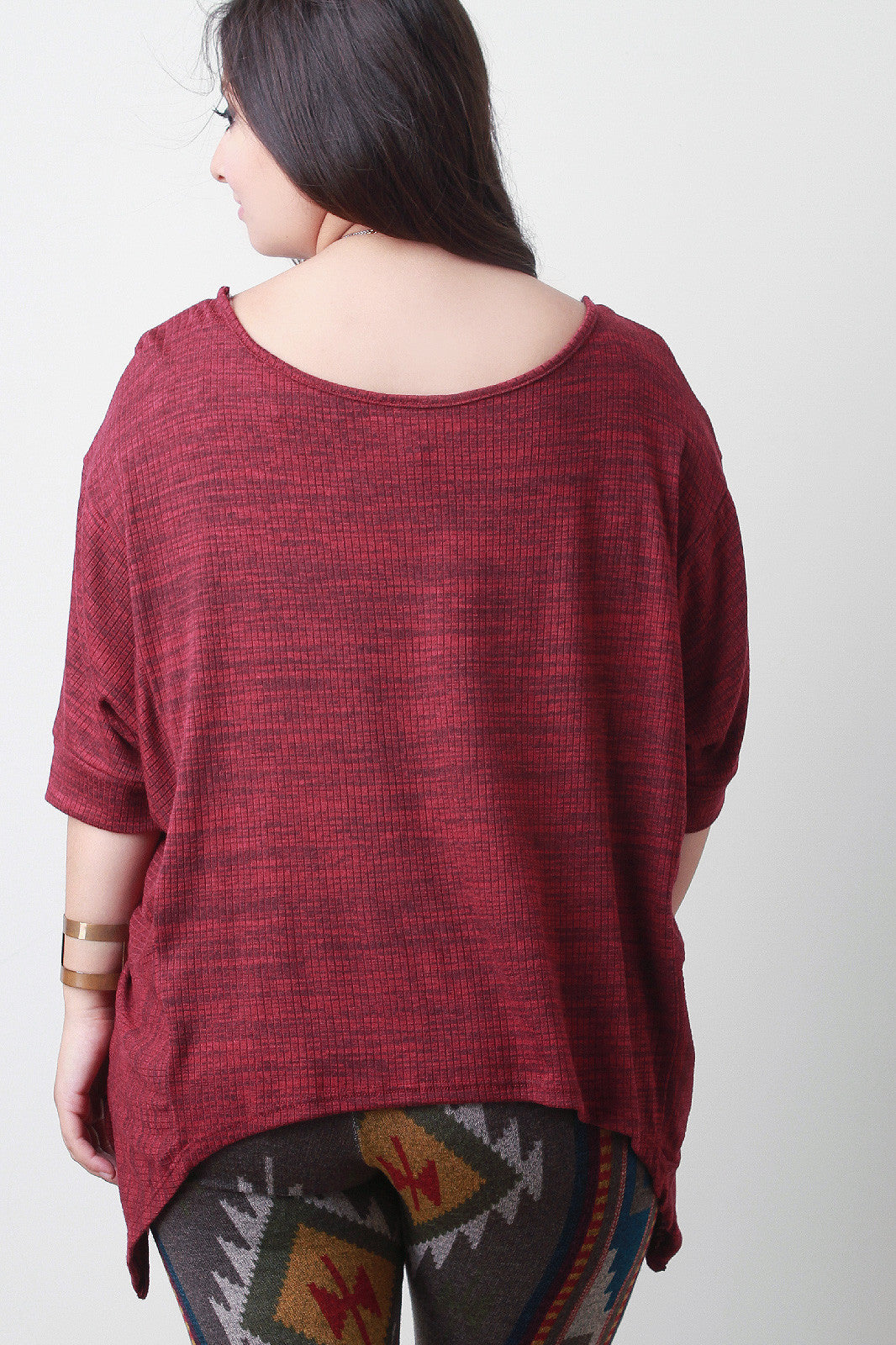 This plus size top features a scooped neckline, dolman sleeves design, side slits detail, and finished with sharkbite hemline. Accessories sold separately. Made in U.S.A. 70% Polyester, 26% Rayon, 4% Spandex.