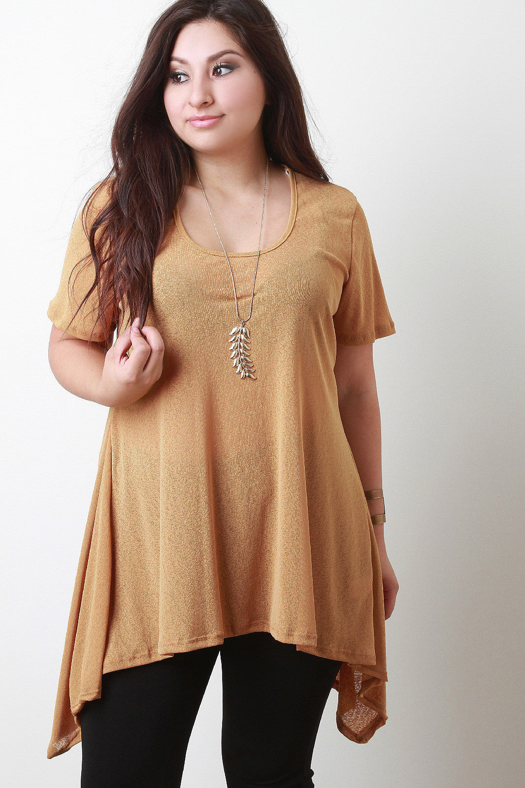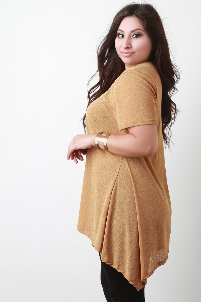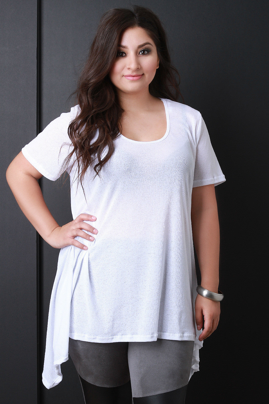 This lovely plus size tunic top features a textured fabrication, scooped neckline, short sleeves design, and asymmetrical sharkbite hemline. Accessories sold separately. Made in U.S.A. 96% Polyester, 4% Spandex.