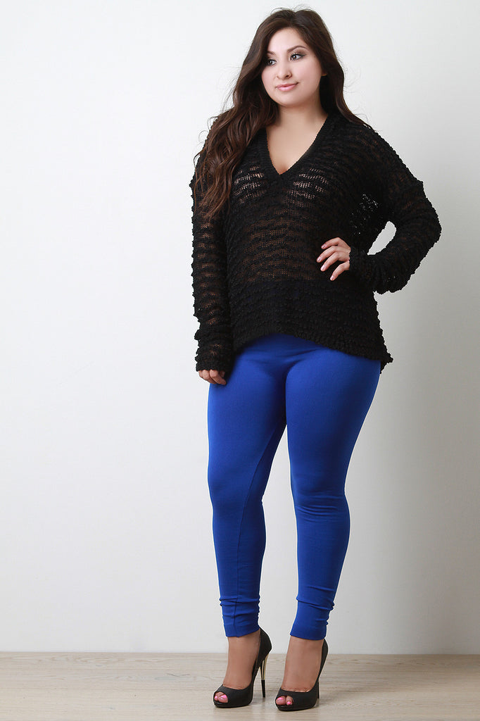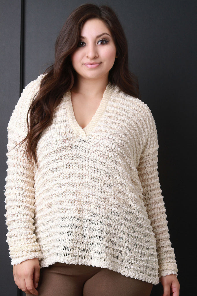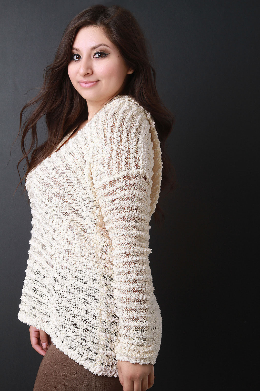 A semi-sheer plus size sweater featuring loose boucle knit, ribbed v-neckline with hood, and dropped shoulders with long sleeves. Accessories sold separately. 50% Acrylic, 50% Polyester.