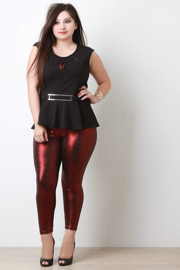 This plus size top is peplum bodice with a curved neckline sleeveless structure. Designed with three keyhole slits and a metallic embellishment along the front. Accessories sold separately. 96% Polyester. 4% Spandex.