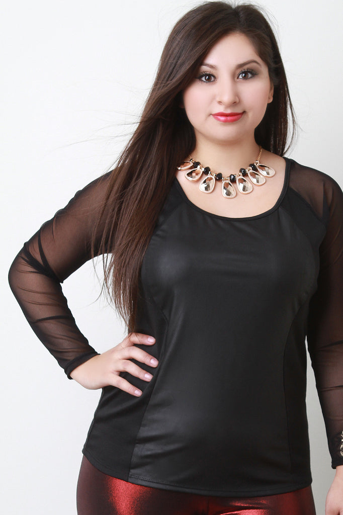 This plus size top is scooped neckline long sleeve bodice, featuring, mesh sleeves. The front of the top has a curve accentuating vegan leather panel. Necklace is included. Other accessories sold separately. 96% Polyester. 4% Spandex.