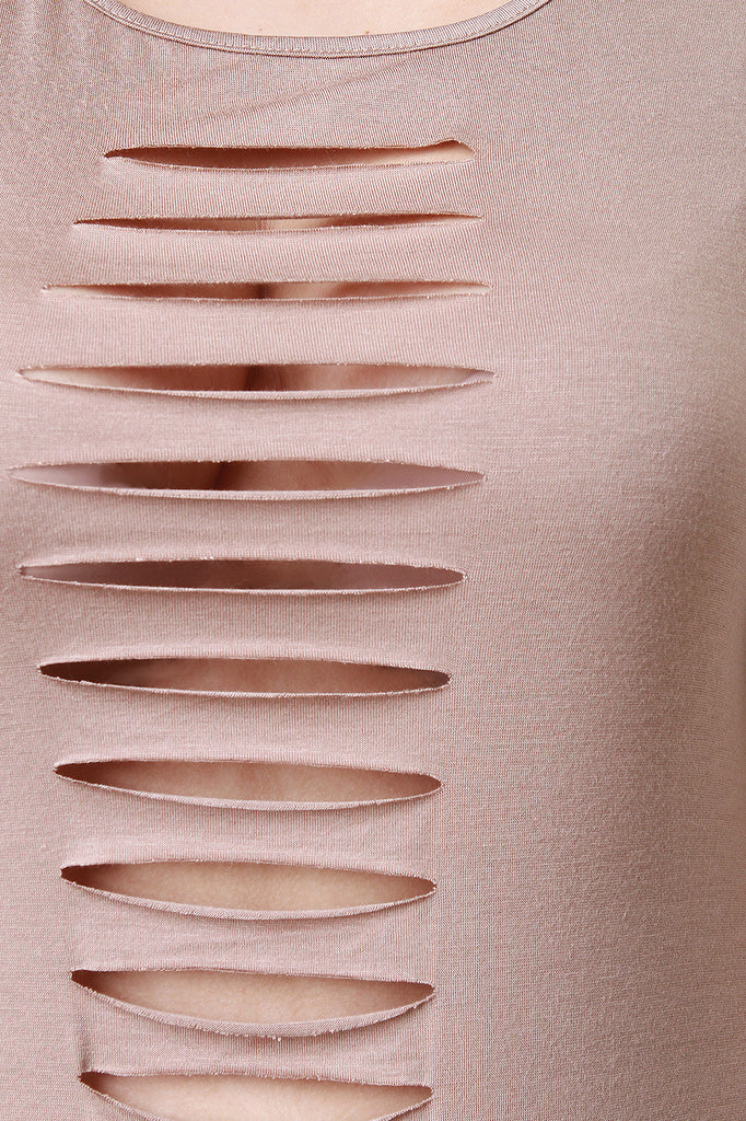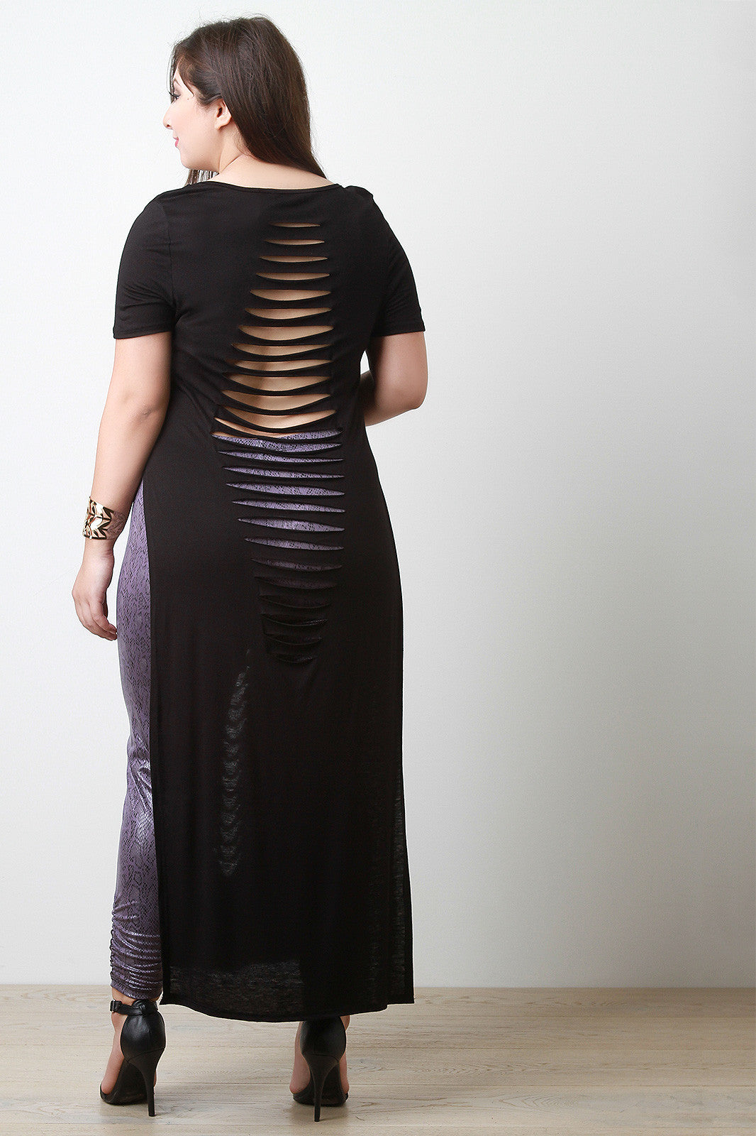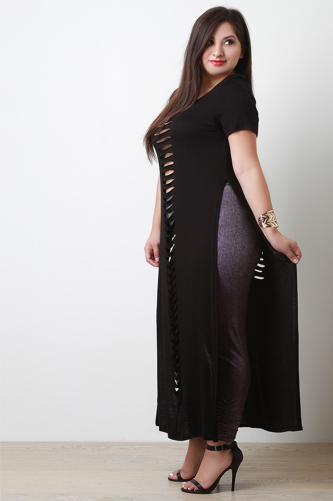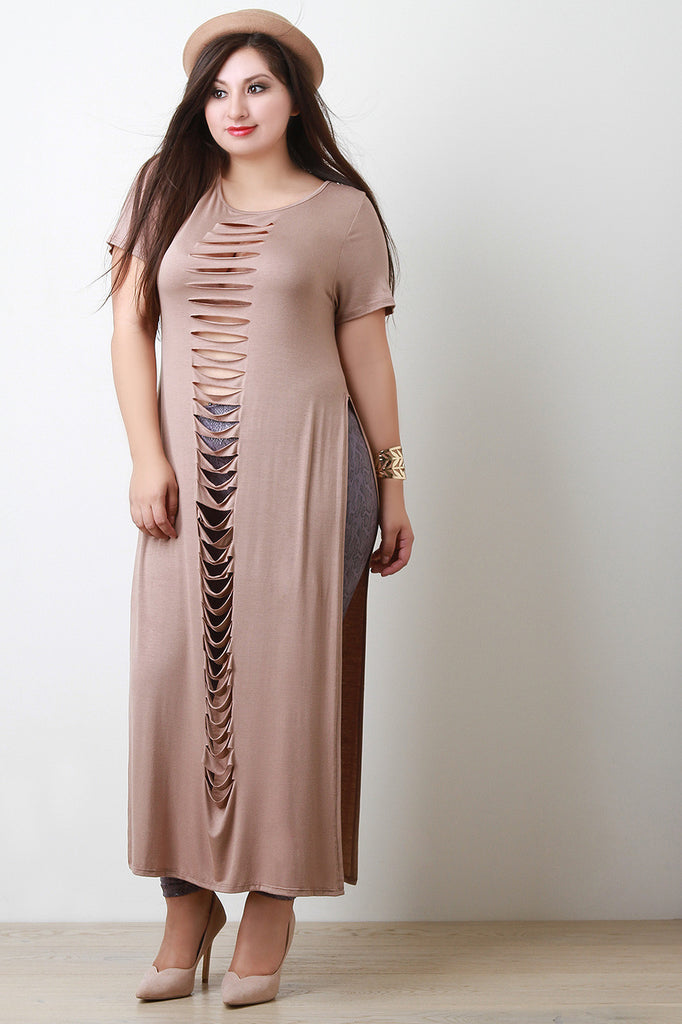 This plus size maxi top features a round neckline, short sleeves, slashed details, and deep side slits. Accessories sold separately. Made in U.S.A.95% Rayon, 5% Spandex.