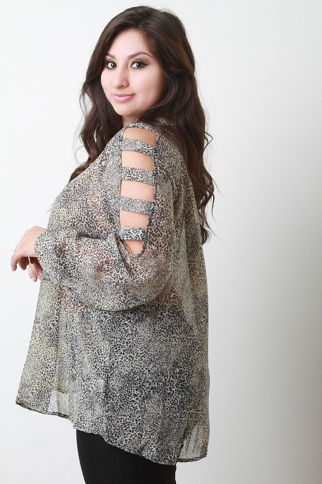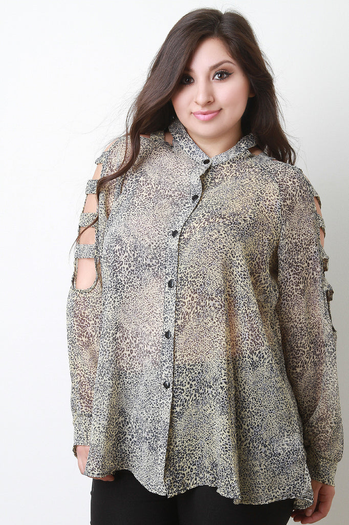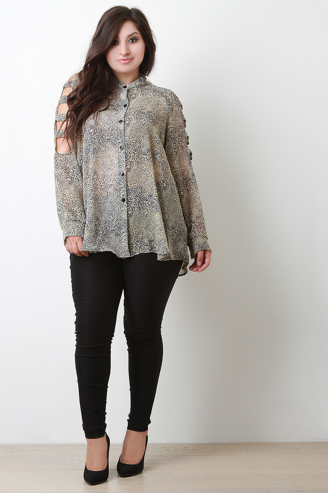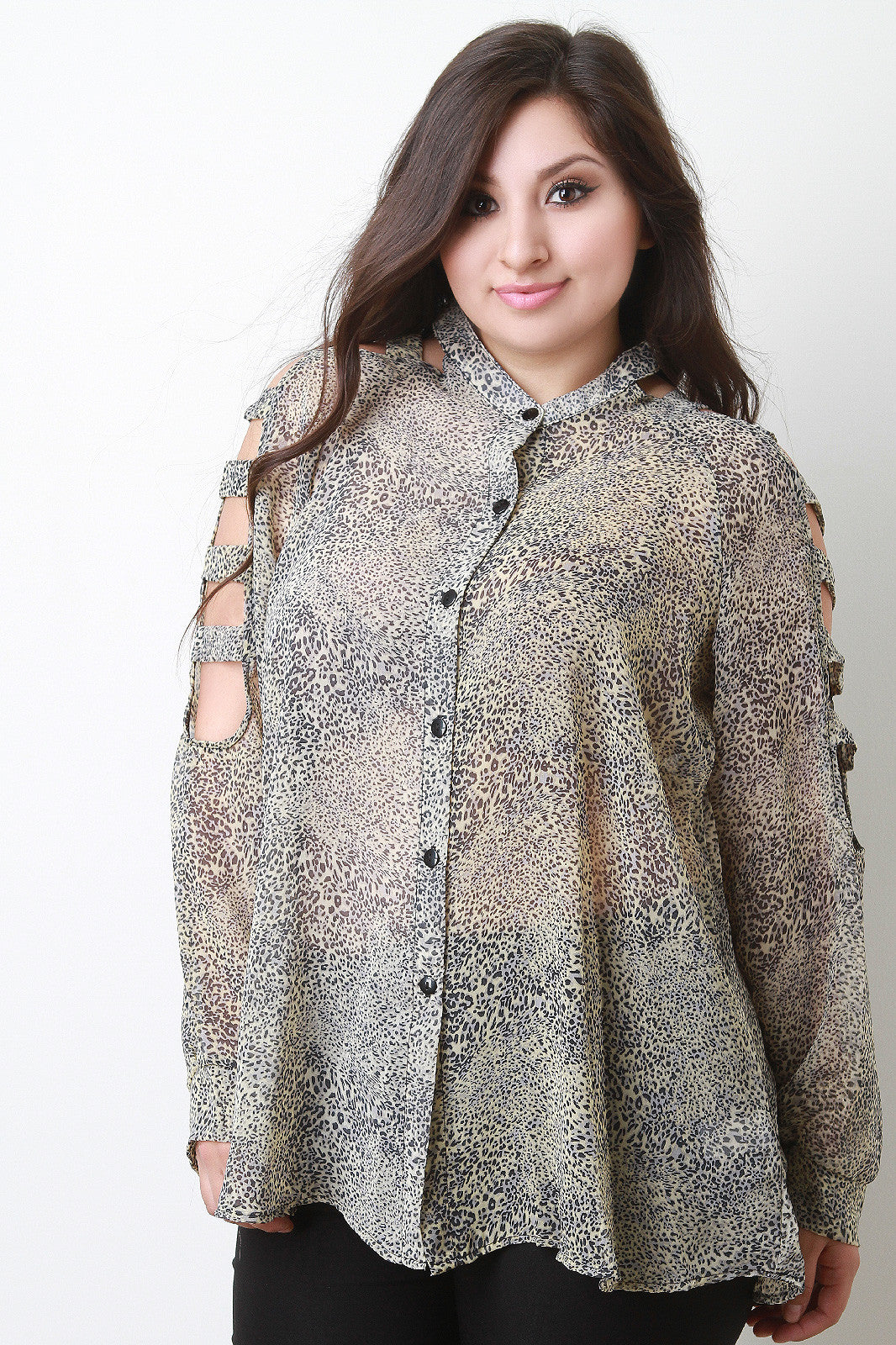 A plus size top with a sheer fabric, a button up, and open shoulders on the sleeves along with a ribbed cutout. Also has a round hem with a high-low hemline. Accessories sold separately. Made in U.S.A. 100% Polyester.