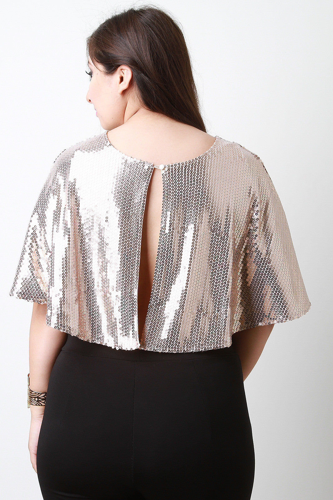 This crop top features a poncho design with sequins throughout, a round neckline, and an open back with a button closure at the top. Accessories sold separately. 95% Polyester, 5% Spandex.