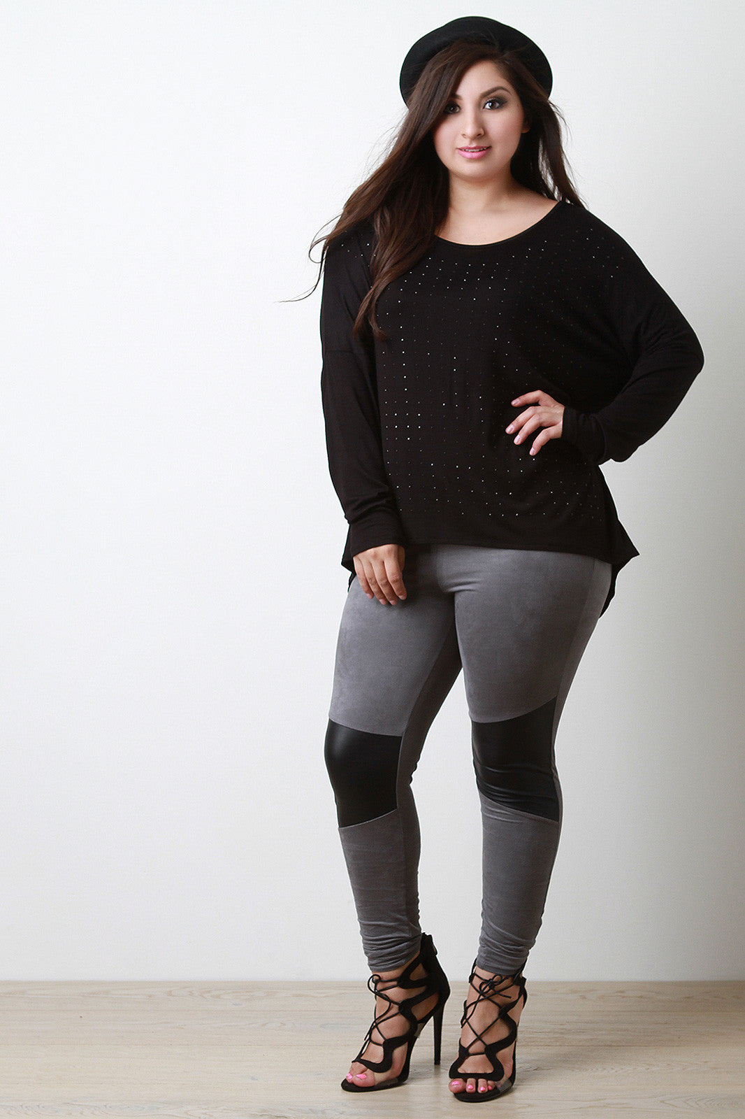 This top features a jersey knit fabrication with a semi-low hemline. the front of the shirt has small rhinestones throughout with a high low hemline and long sleeves. Accessories sold separately. Made in US.A. 95% Rayon, 5% Spandex.