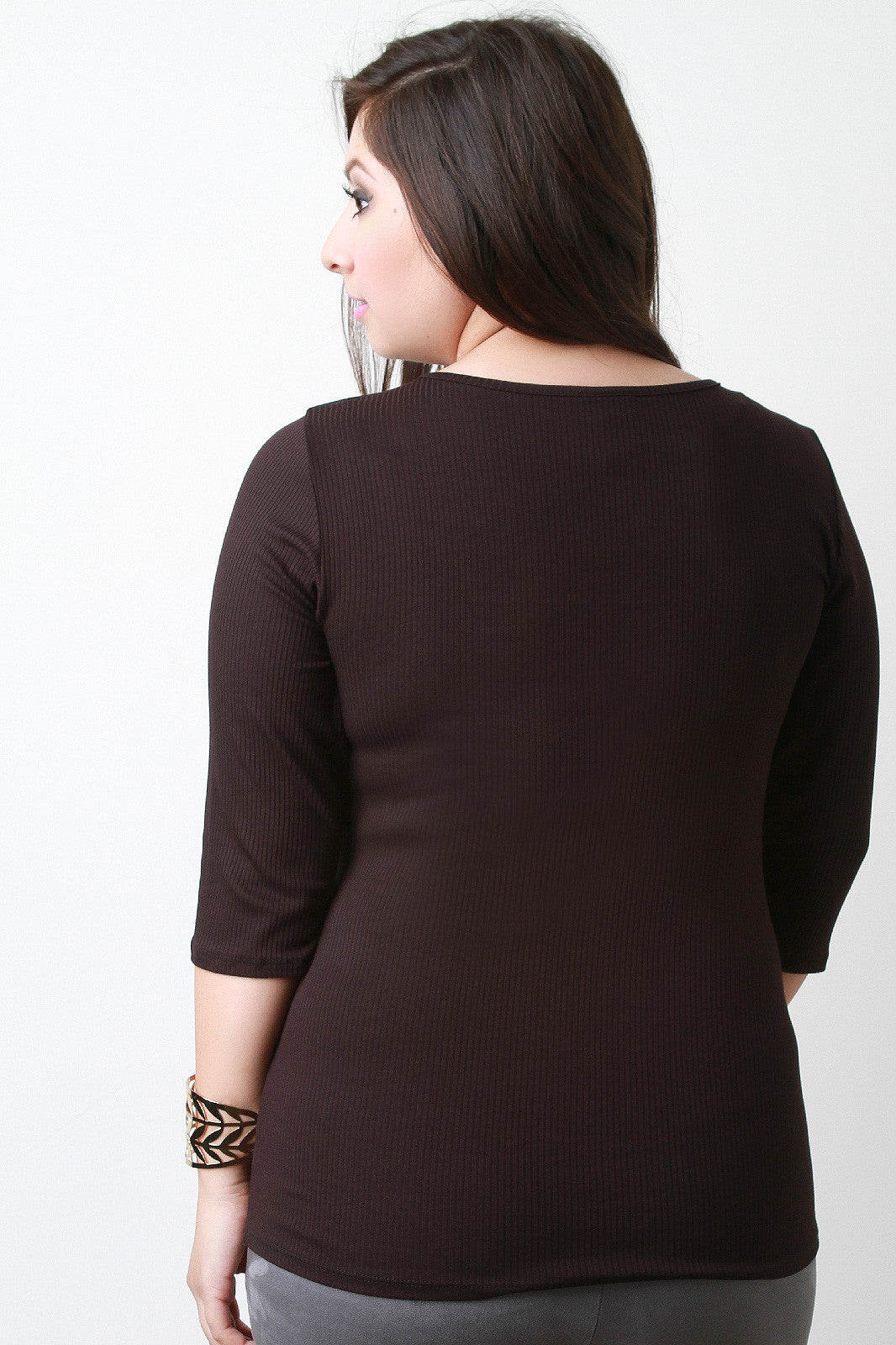 This plus size top, features a surplice neckline and quarter sleeves. Designed with decor pocket flaps and decor buttons. Ribbed fabrication. Accessories sold separately. 97% Rayon. 3% Spandex.