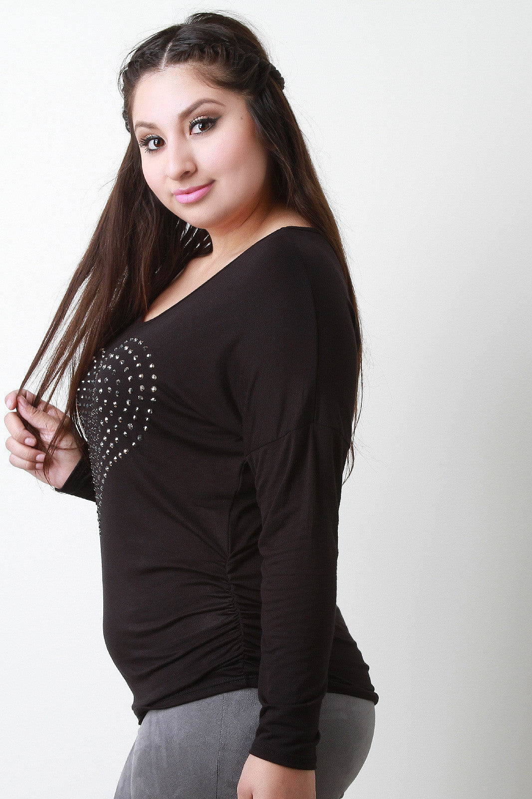 This plus size jersey knit top features a round neckline, long sleeves, elasticized ruched sides, and rhinestone heart shape d�cor front. Accessories sold separately. Made in U.S.A. 97% Rayon, 3% Spandex.