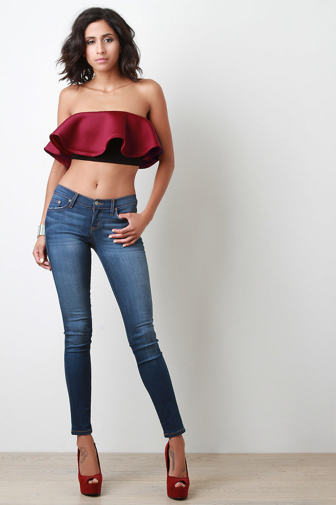 This strapless top features an elasticized tube neckline, scuba knit ruffle flare tier, and crop tube underlay. Accessories sold separately. Made in U.S.A. 96% Polyester, 4% Spandex.