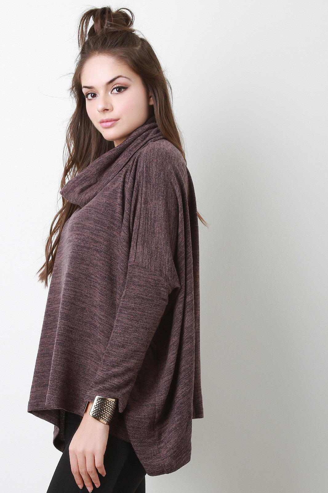 This sweater features soft melange knit, cowl neck, dropped shoulders, long sleeves, tulip design at back, and slight high-low hemline. Accessories sold separately. 61% Polyester, 31% Rayon, 8% Spandex.