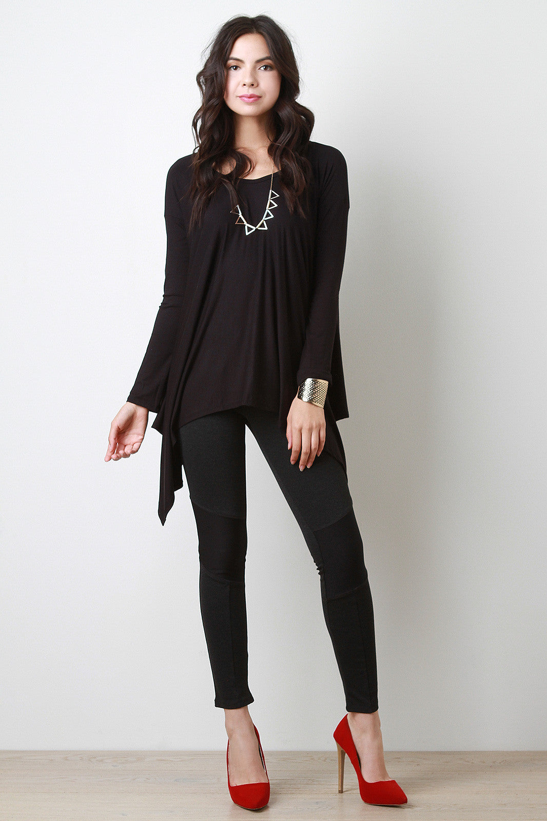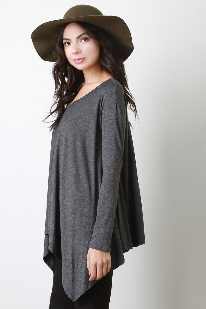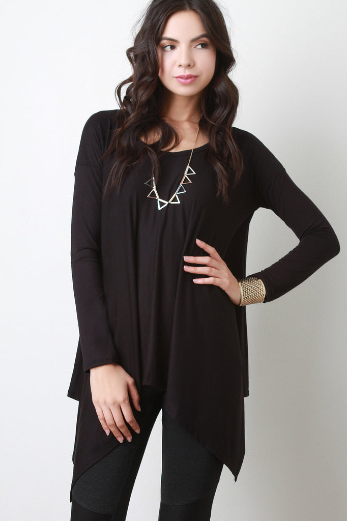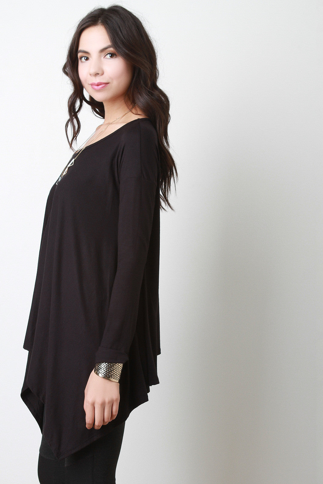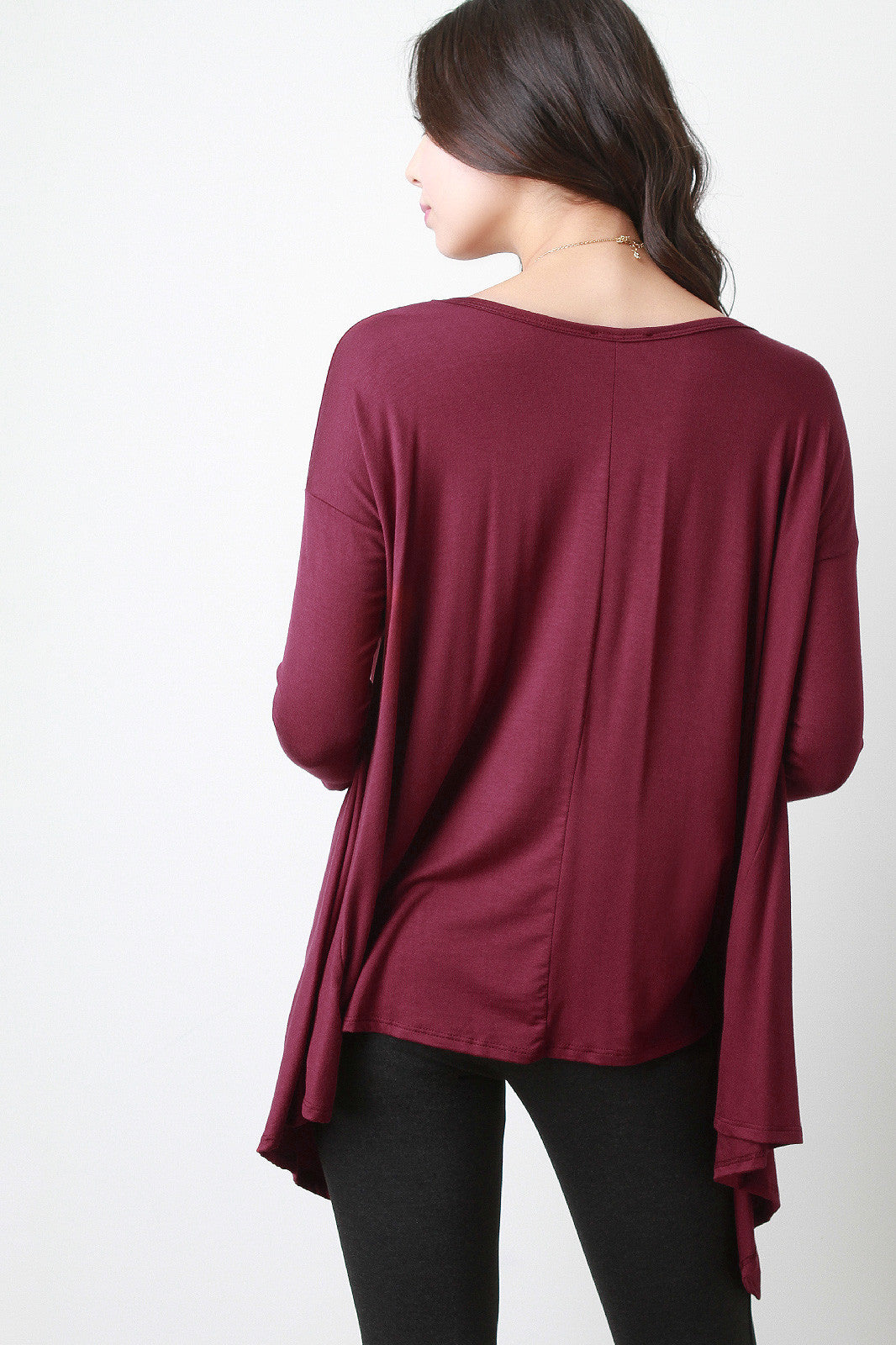 This oversize top features a scoop neckline, long sleeves design, and sharkbite hemline. Unlined. Accessories sold separately. Made in U.S.A. 95% Rayon, 5% Spandex.