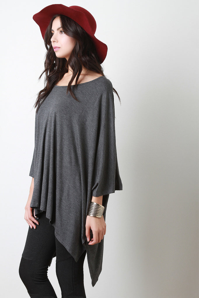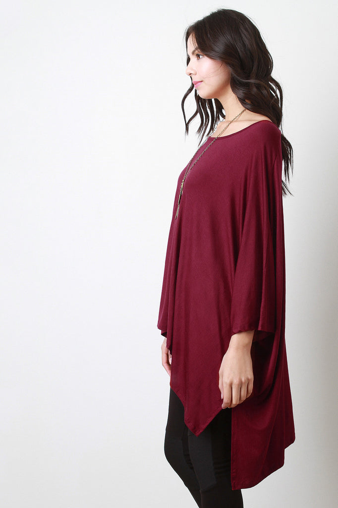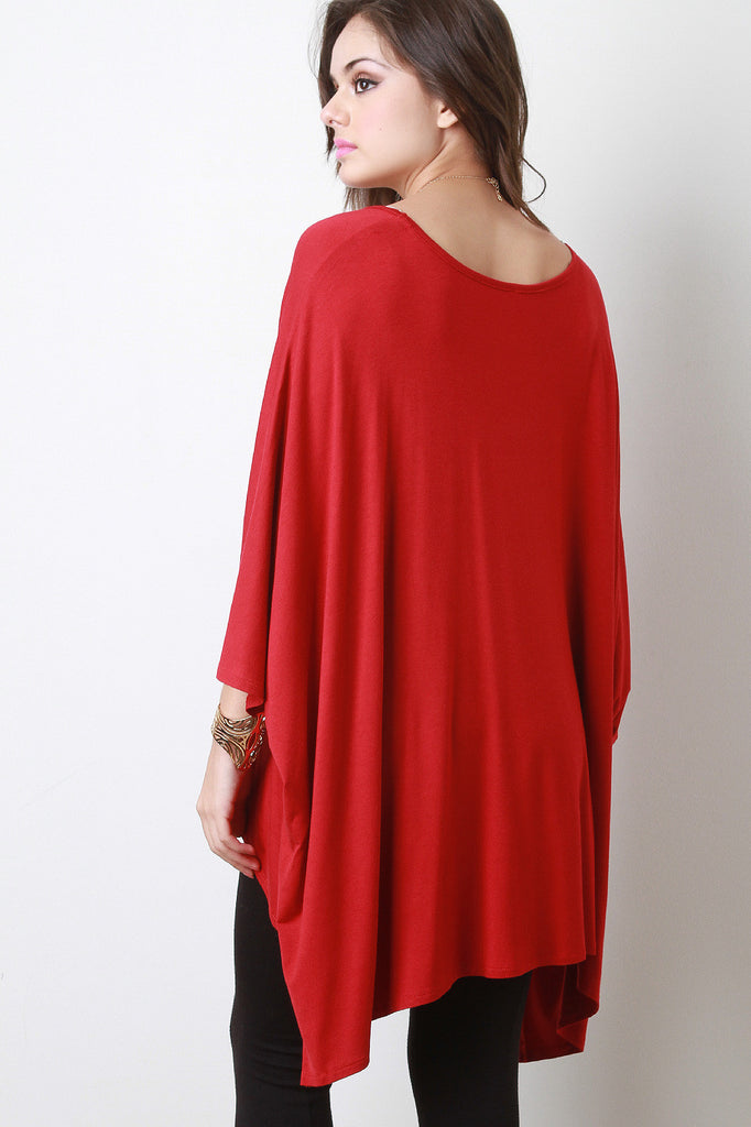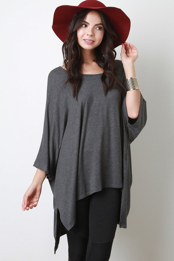 This oversized top features a scoop neckline, dolman sleeves design, double slits detail, and finished with high low hemline. Accessories sold separately. Made in U.S.A. 93% Rayon, 7% Spandex.