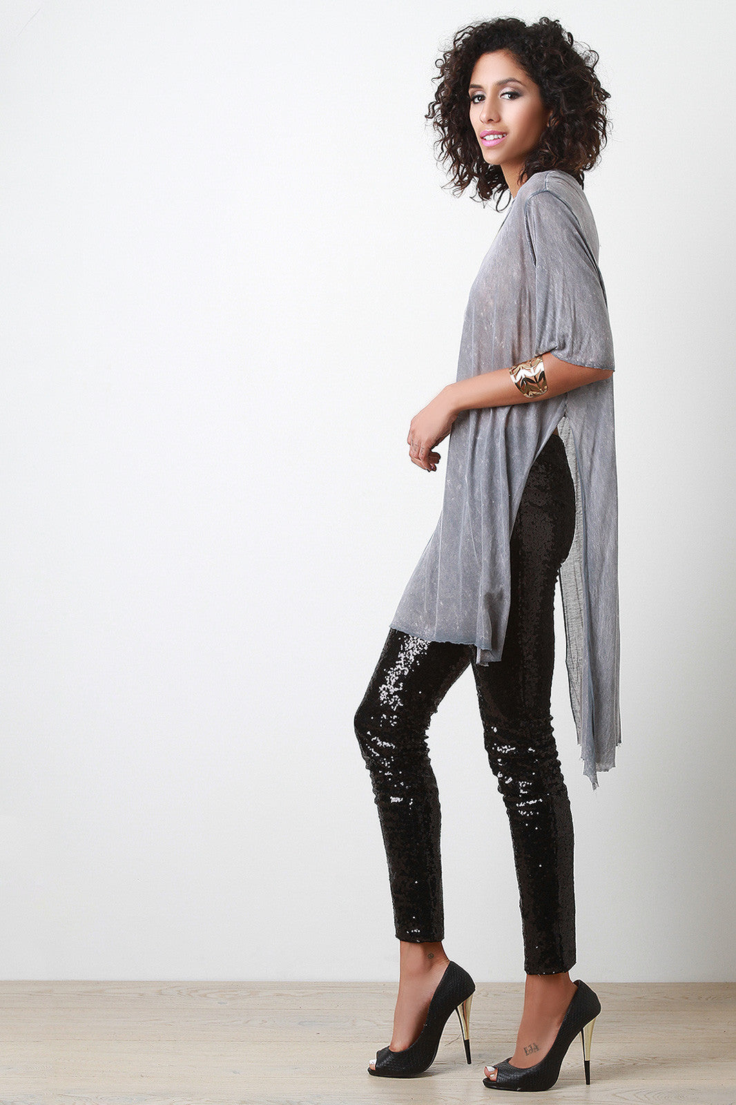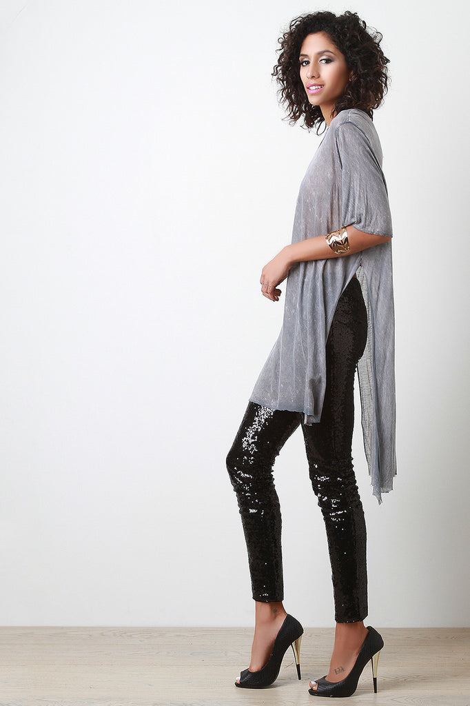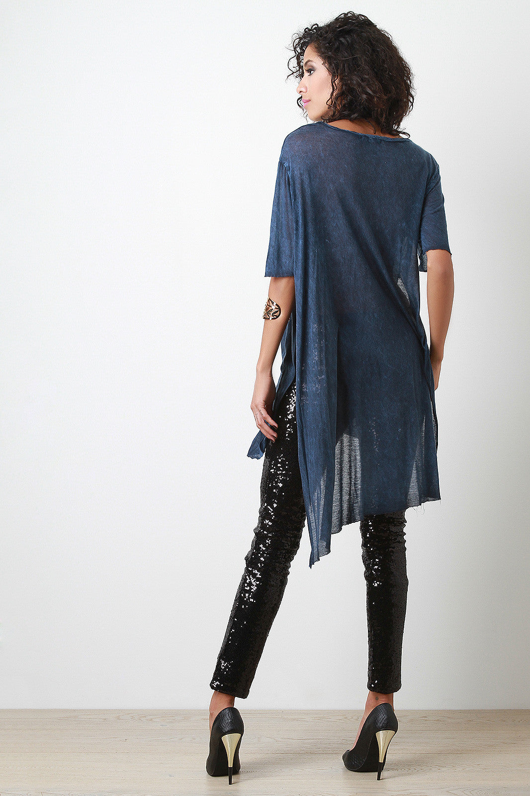 A semi-sheer oversize tee featuring washed jersey, a round neckline, dropped shoulders with half sleeves, and a high-low hem with high side slits. Unlined. Accessories sold separately. 100% Lyocell.