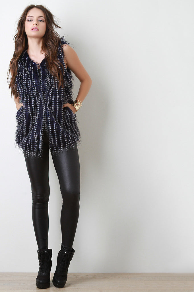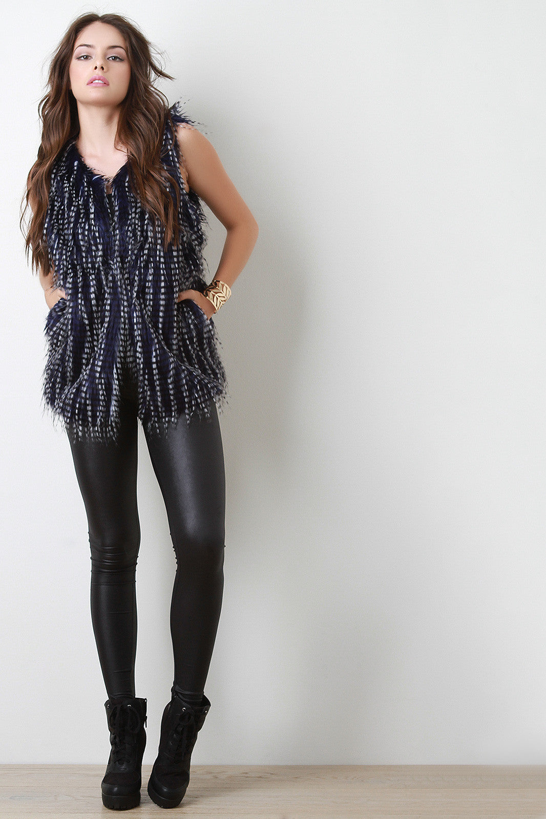 This sleeveless faux fur vest features long hair design with stripes design, open front, single hook-n-eye closure, side pockets, and fully lined. Accessories sold separately. 100% Polyester.
