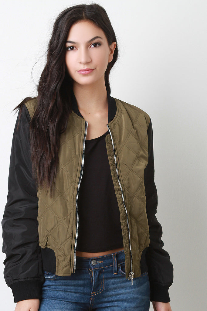 This timeless bomber jacket features a zip-up front, long sleeves with faux zipper pocket on left side, two faux side pockets, ribbed knit trimming, and contrast lining. Accessories sold separately. 100% Polyester.