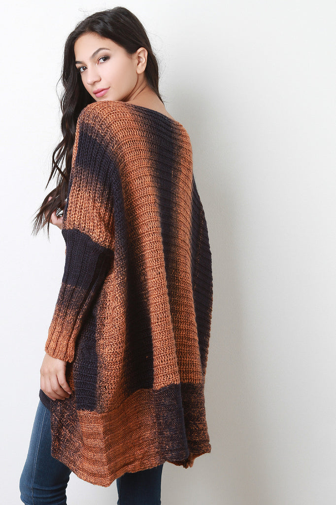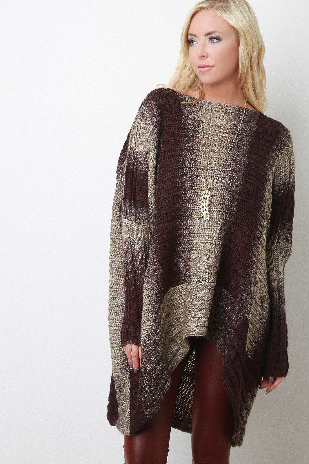 This oversize sweater features a scooped boat neckline, vertical ombre stripes, and dropped shoulders with dolman sleeves. Also features mixed knitting styles including loose knit, different widths of ribbing, and cable knit designs. Finished with high-low hemline. Unlined. Accessories sold separately. 20% Wool, 80% Acrylic.