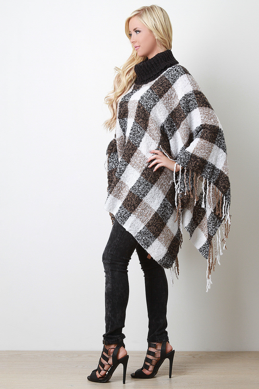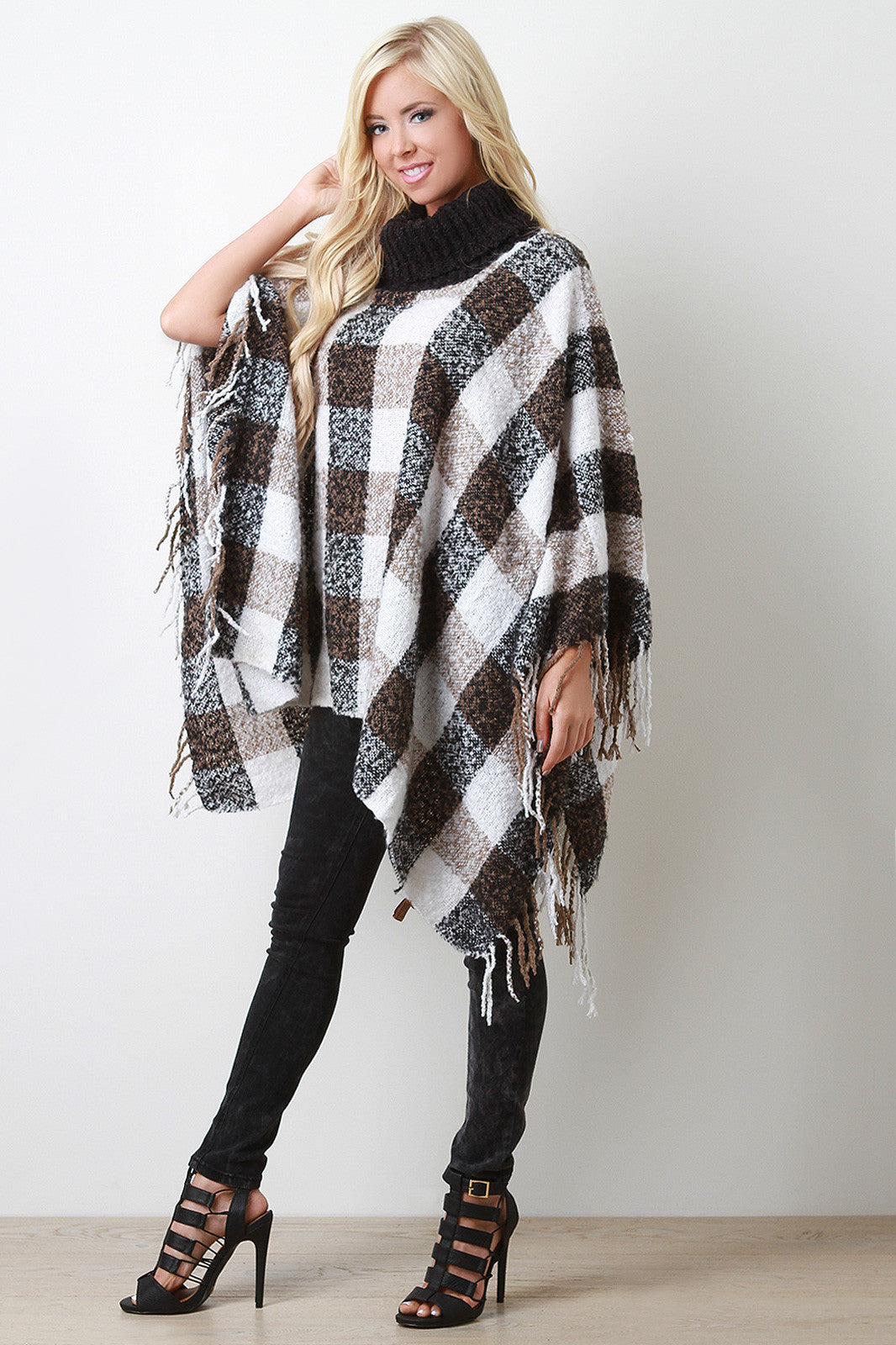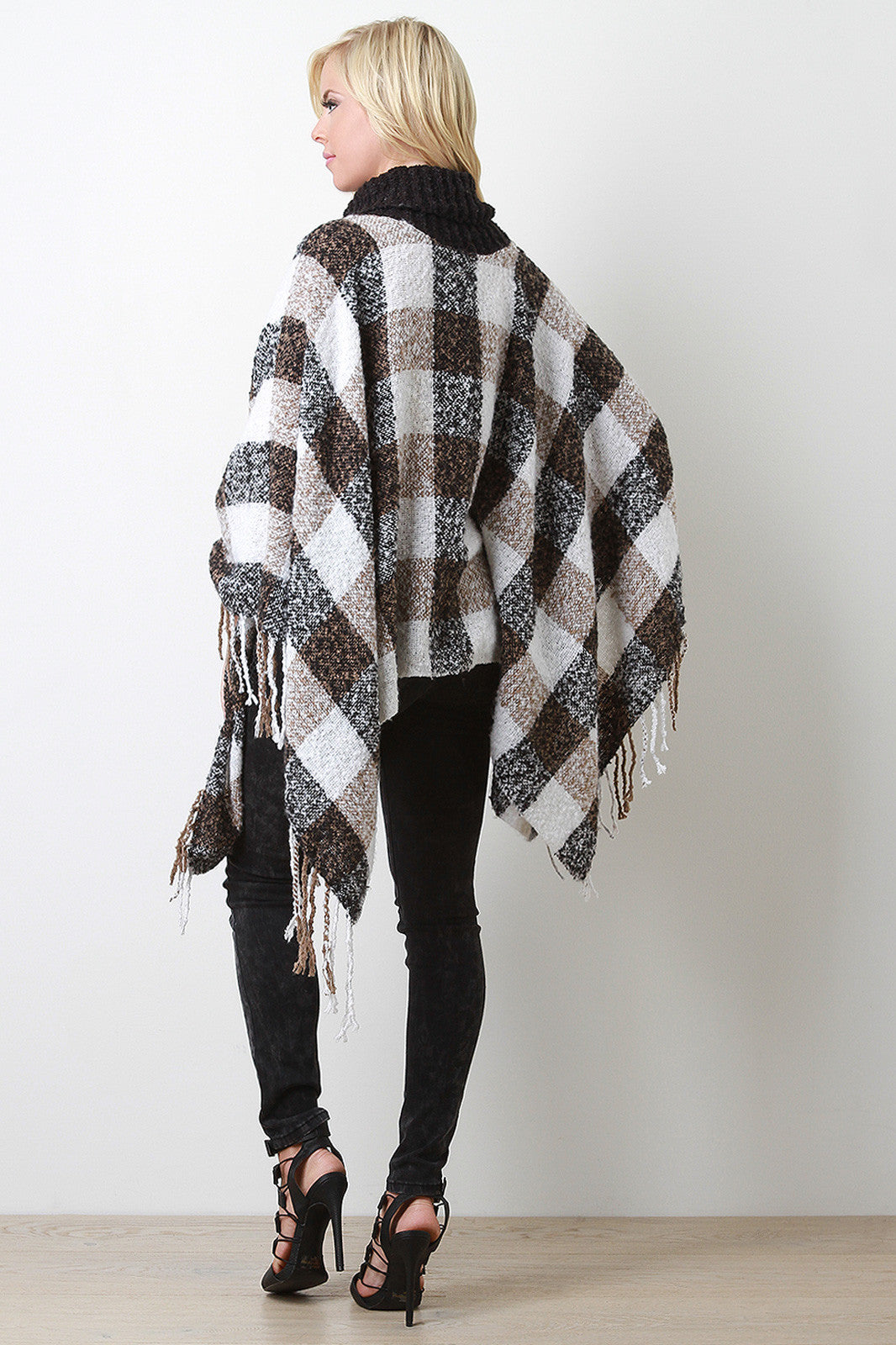 This knit poncho features a fold-over turtleneck, plaid patterned print, pullover style, fringe design sleeve, and finished with asymmetrical hemline. Accessories sold separately. 100% Acrylic.