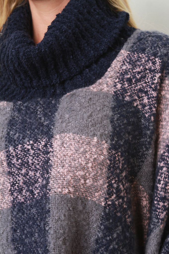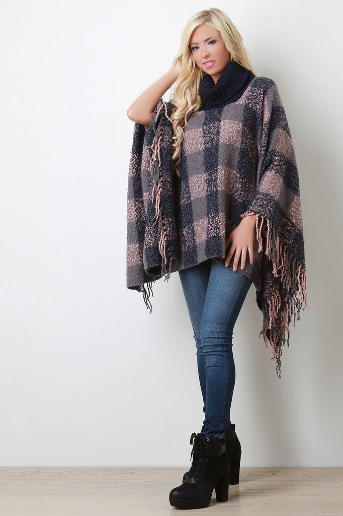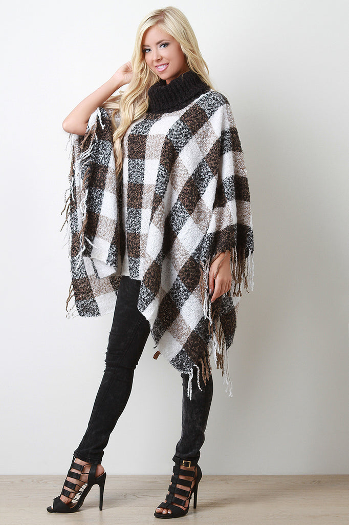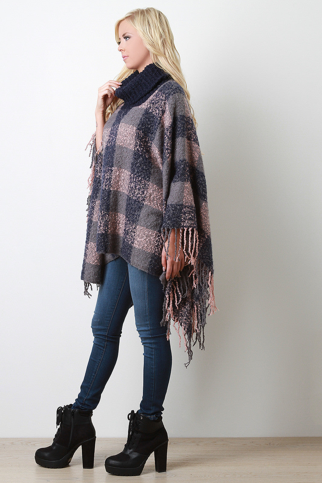 This knit poncho features a fold-over turtleneck, plaid patterned print, pullover style, fringe design sleeve, and finished with asymmetrical hemline. Accessories sold separately. 100% Acrylic.