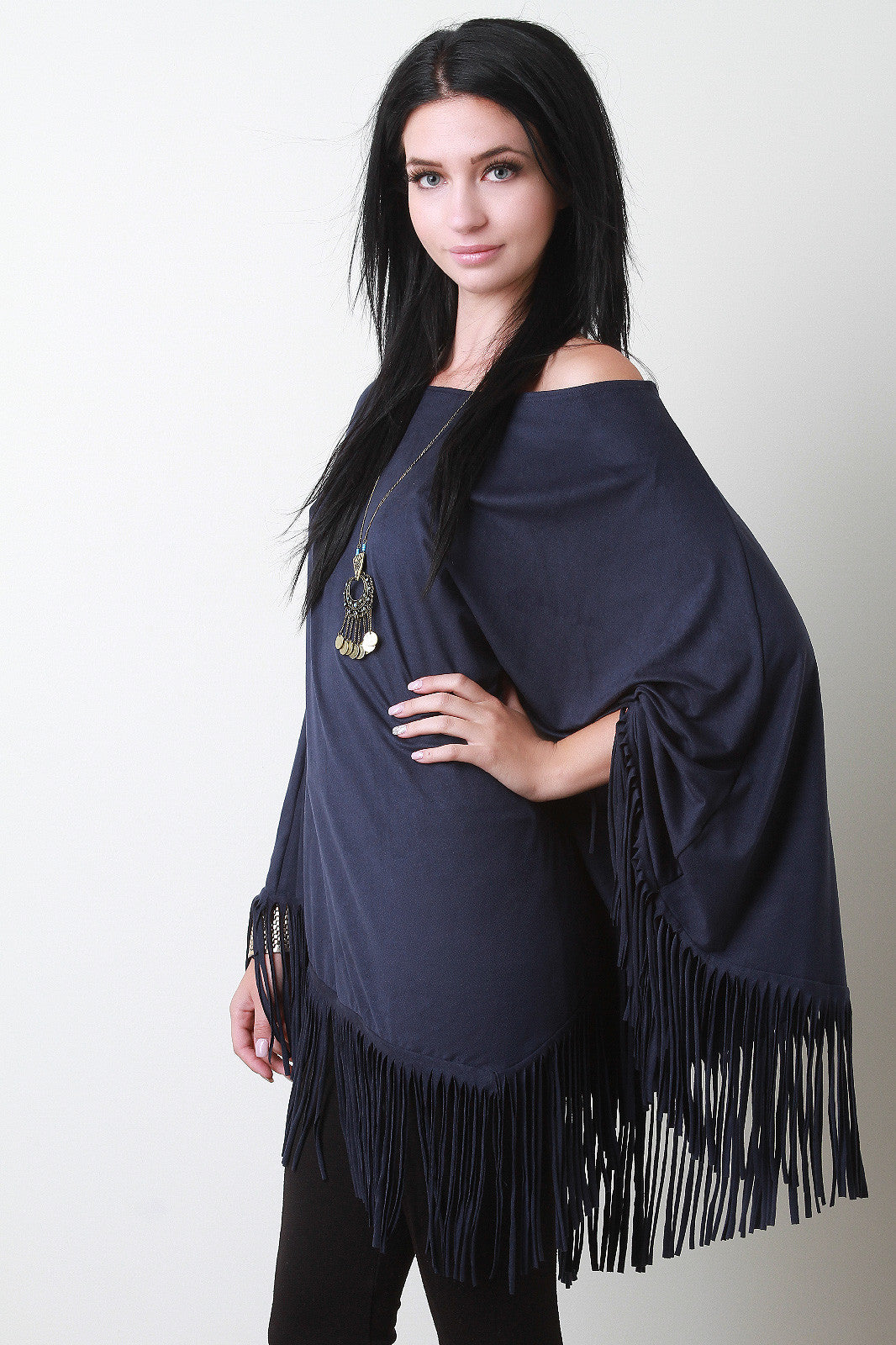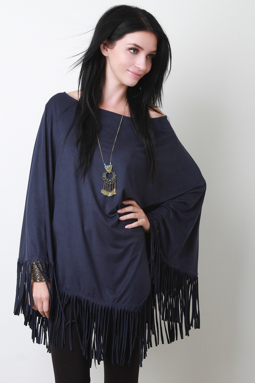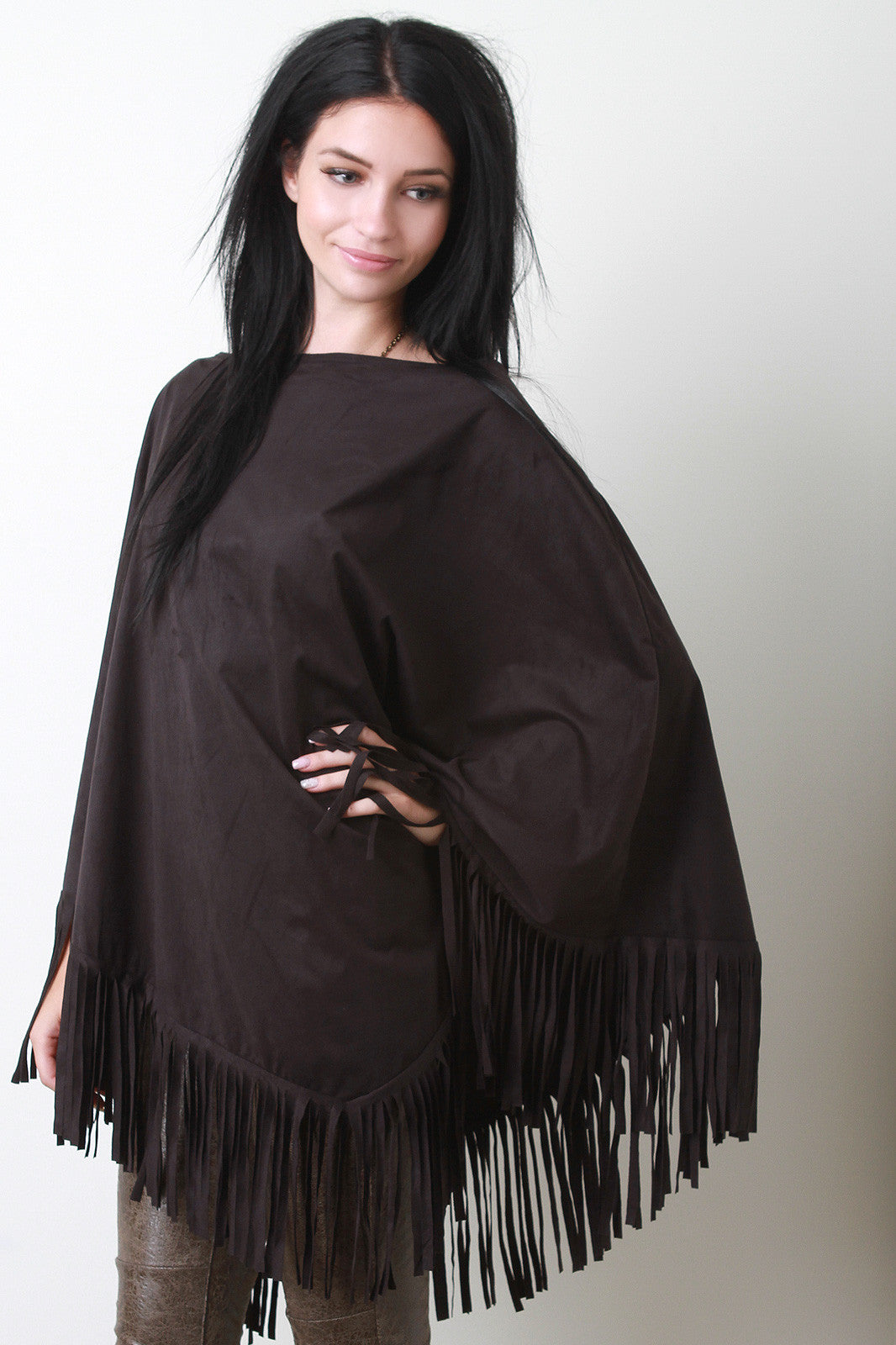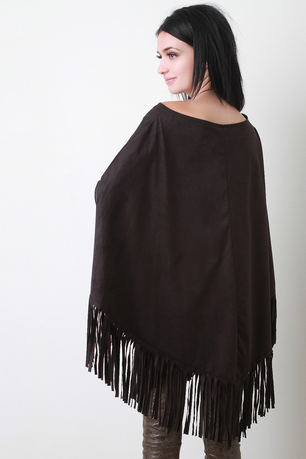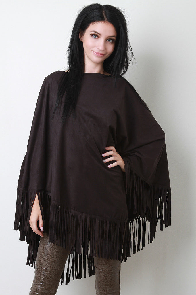A faux suede poncho with a round neckline and fringe hem. Accessories sold separately. Made in U.S.A. 90% Polyester, 10% Spandex.