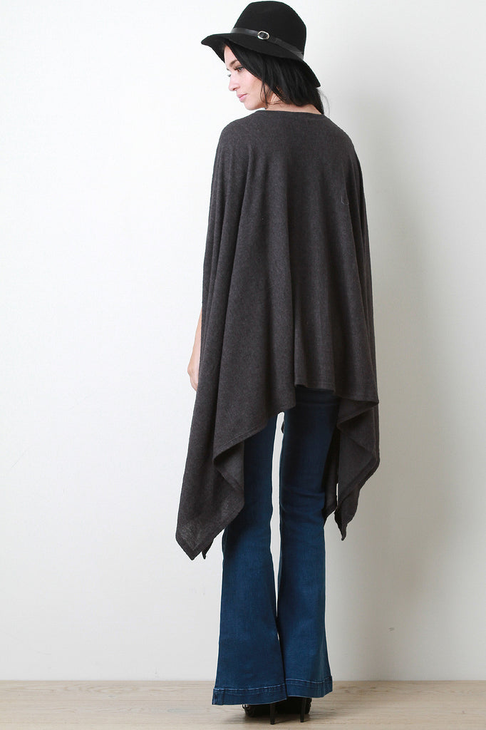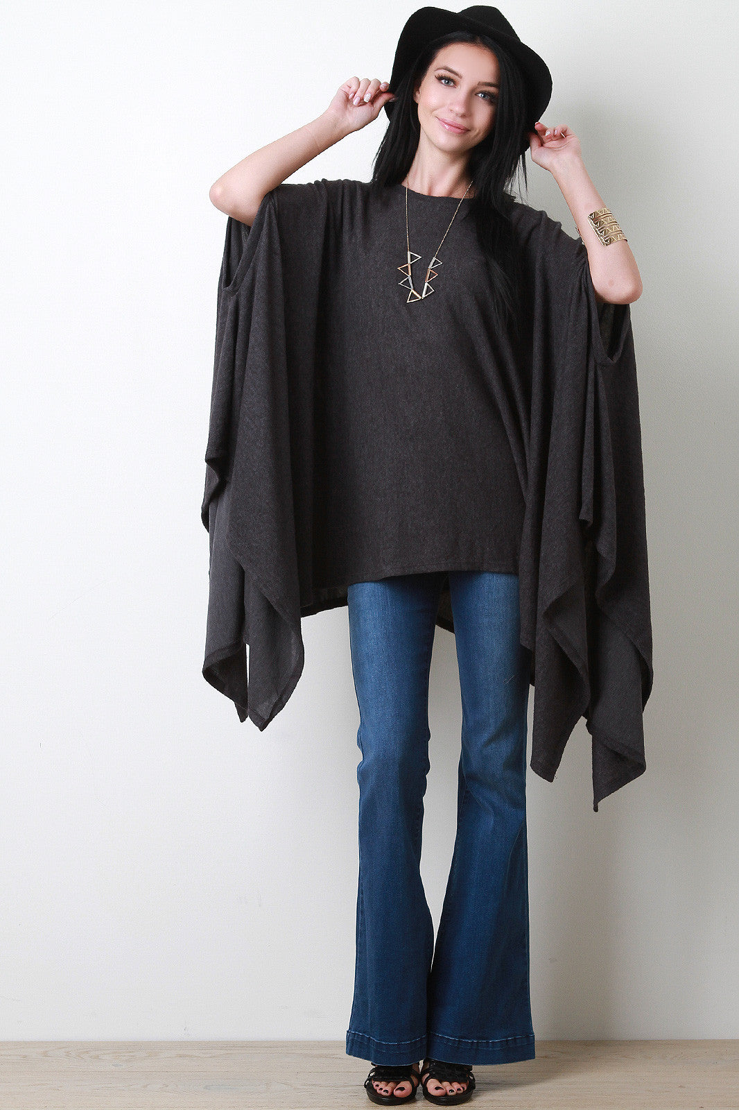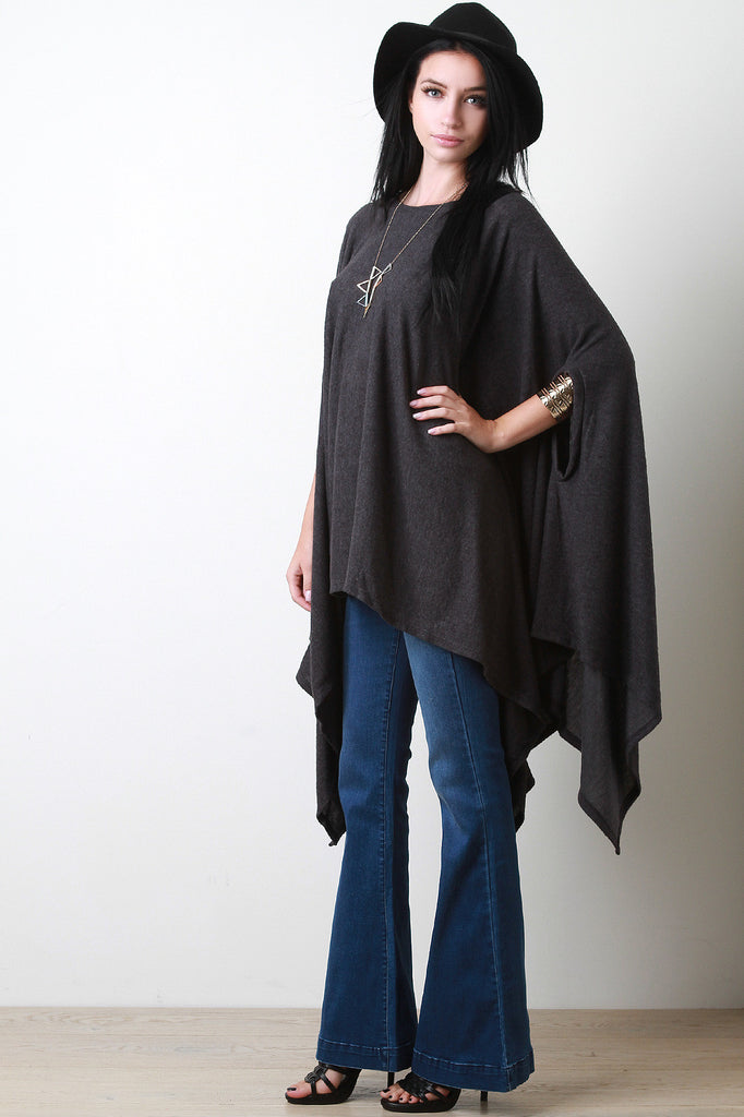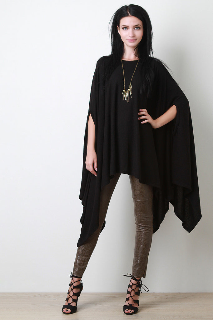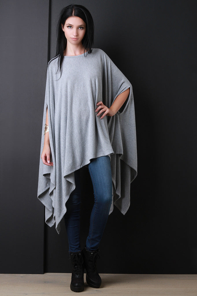 A maxi top featuring soft fleecey knit, a round neckline, and arm hole slits. Finished with a draping handkerchief hemline. Accessories sold separately. Made in U.S.A. 67% Polyester, 29% Rayon, 4% Spandex.