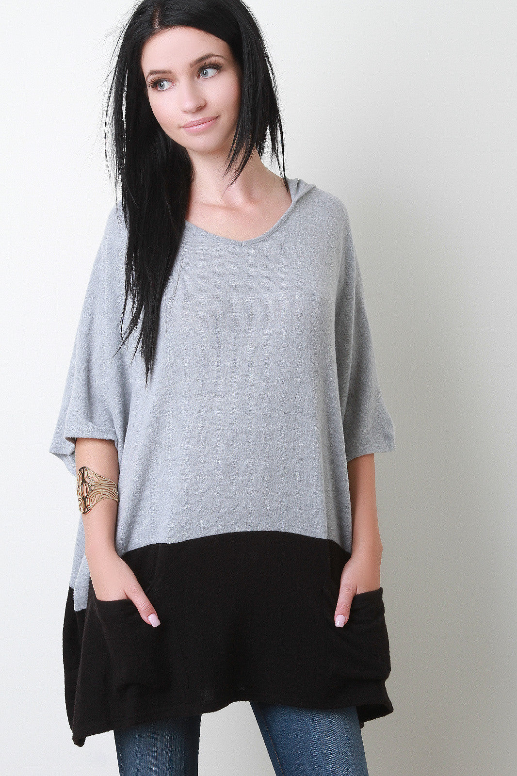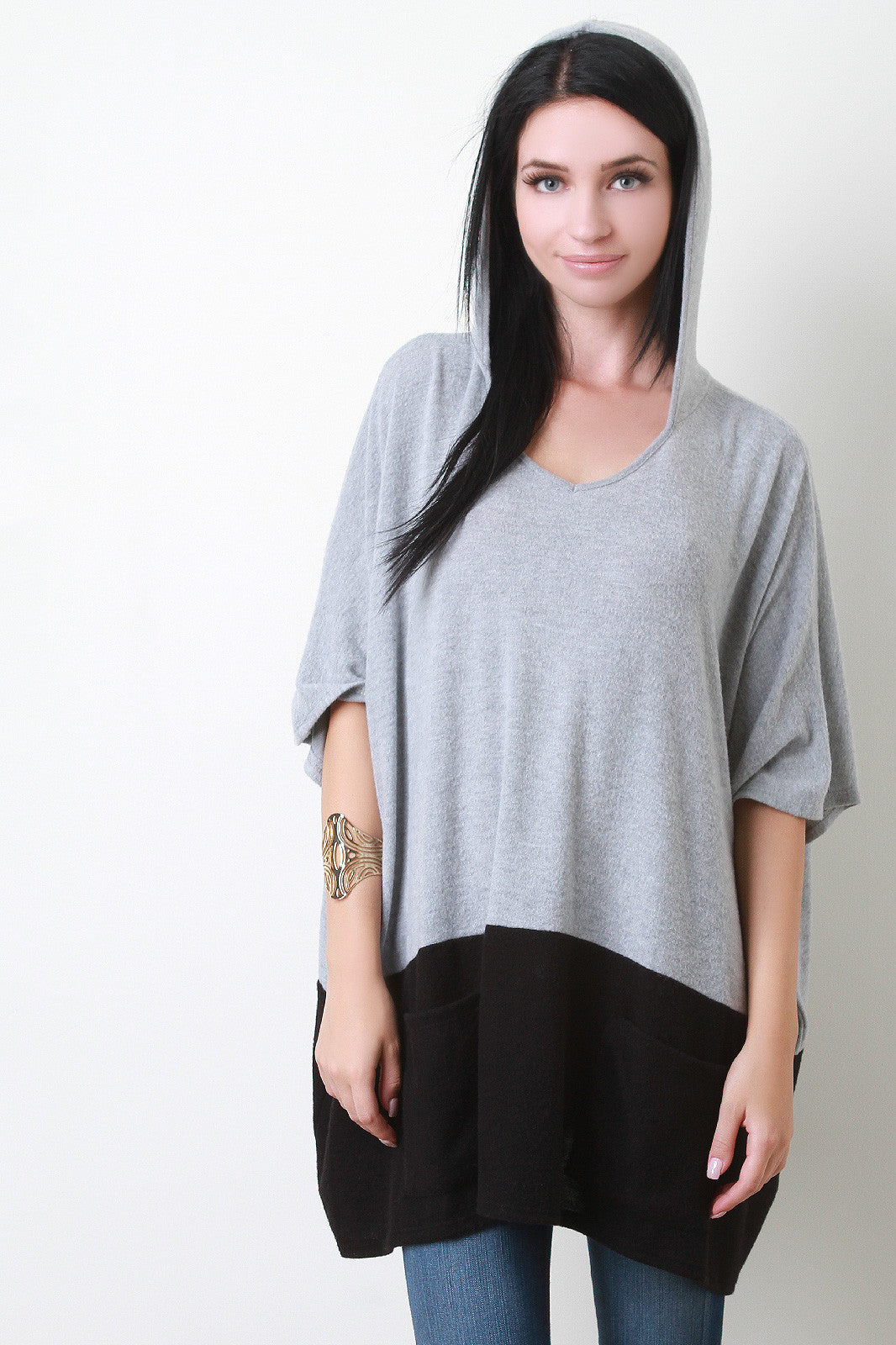 This two-tone hooded sweater features a soft fleecey fabric, v-neckline, and short batwing sleeves. Finished with a loose fit, two front slip pockets, and contrast color block hem. Accessory sold separately. Made in U.S.A. 67% Polyester, 29% Rayon, 4% Spandex.
