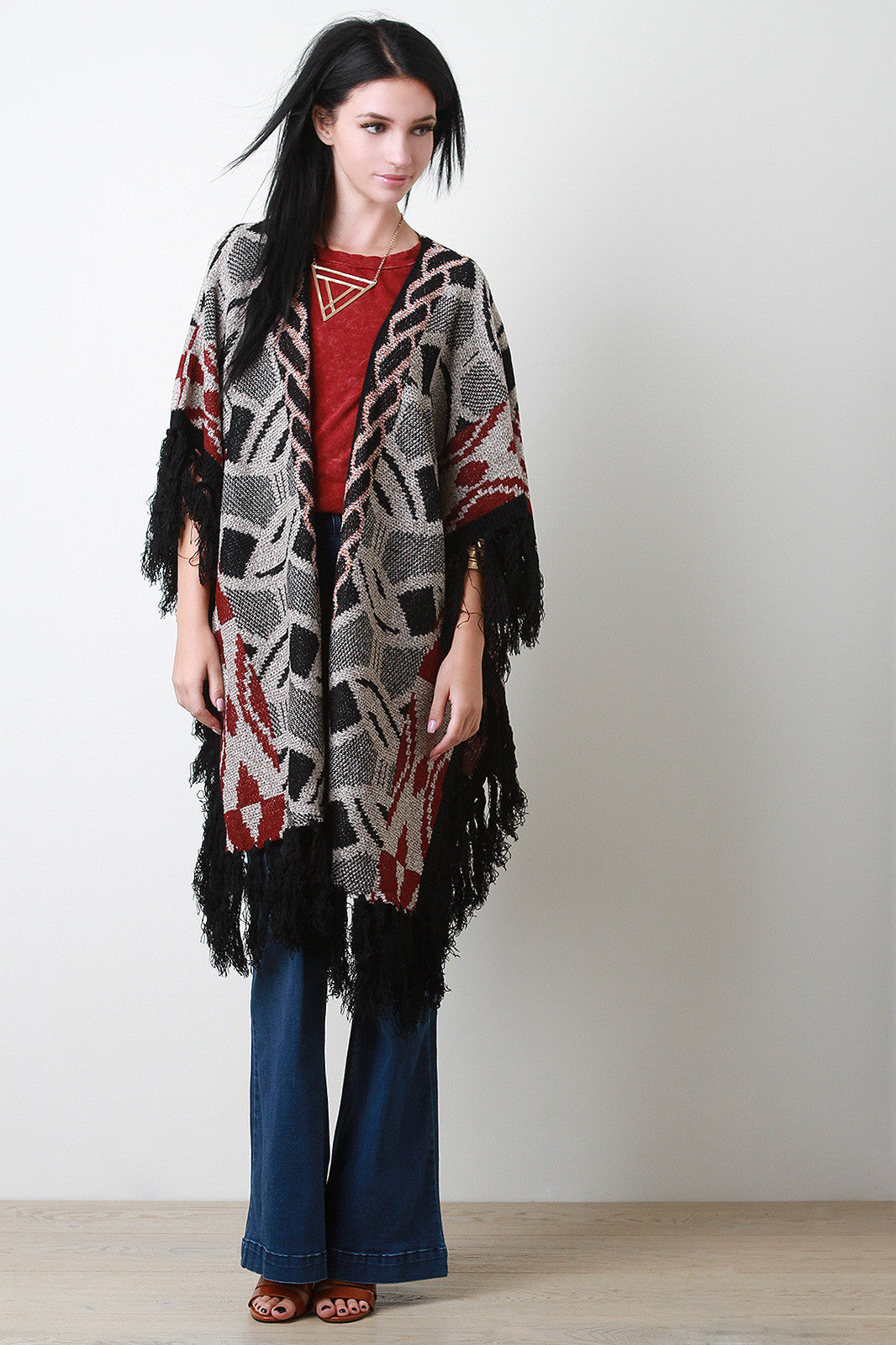 This longline cardigan features thick knit, mixed patterns, open front, long sleeves, asymmetrical hemline and finished with fringe accent. Accessories sold separately. 55% Cotton, 45% Acrylic.