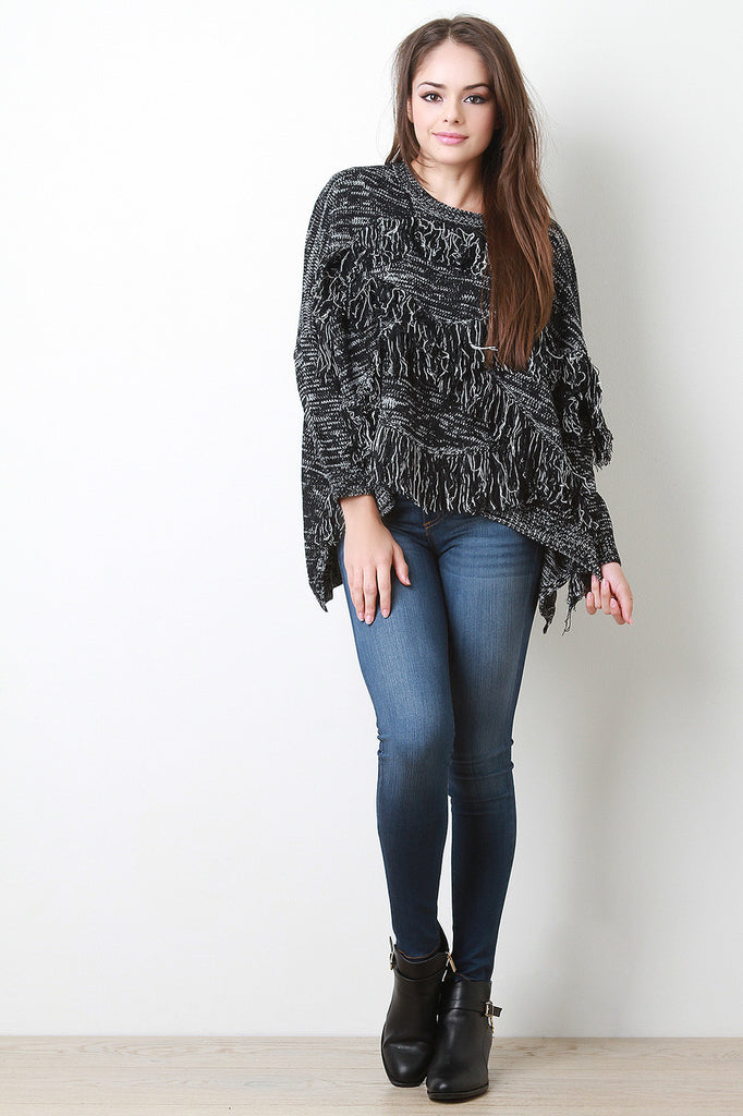 This cozy sweater features thick melange knit, round neckline, long sleeves, fringe accents, and finished with high-low hemline. Accessories sold separately. 55% Cotton, 45% Acrylic.