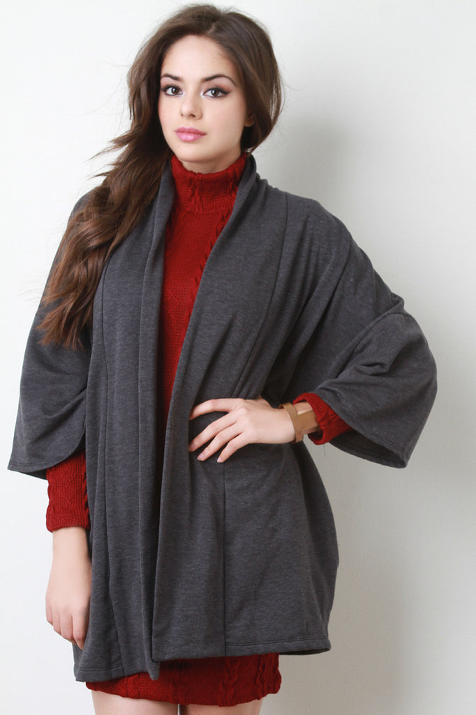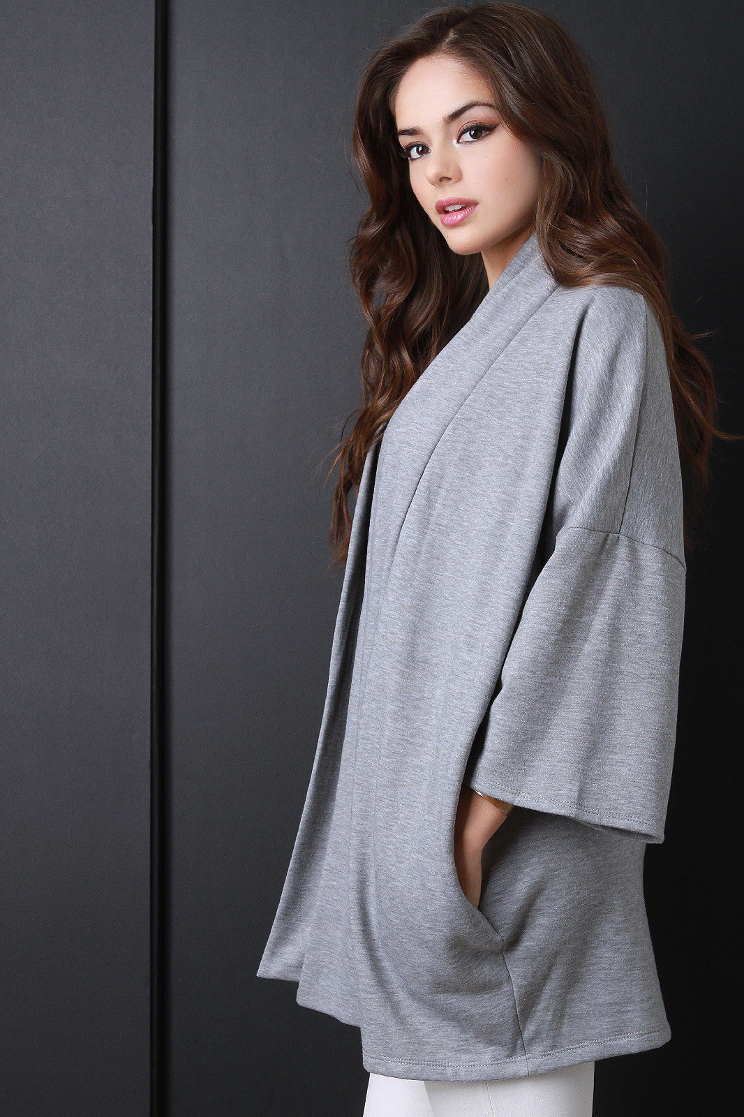 A cardigan made of brushed French terry with a soft fleece-like interior, open front, and wide three-quarter sleeves with dropped shoulders. Finished with side pockets. Accessories sold separately. Made in U.S.A. 87% Polyester, 10% Rayon, 3% Spandex.