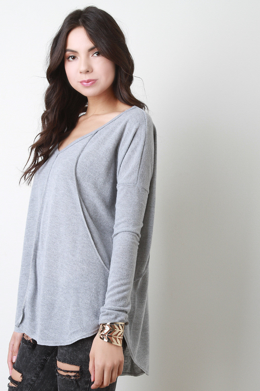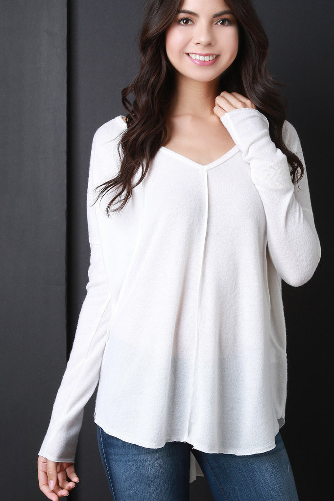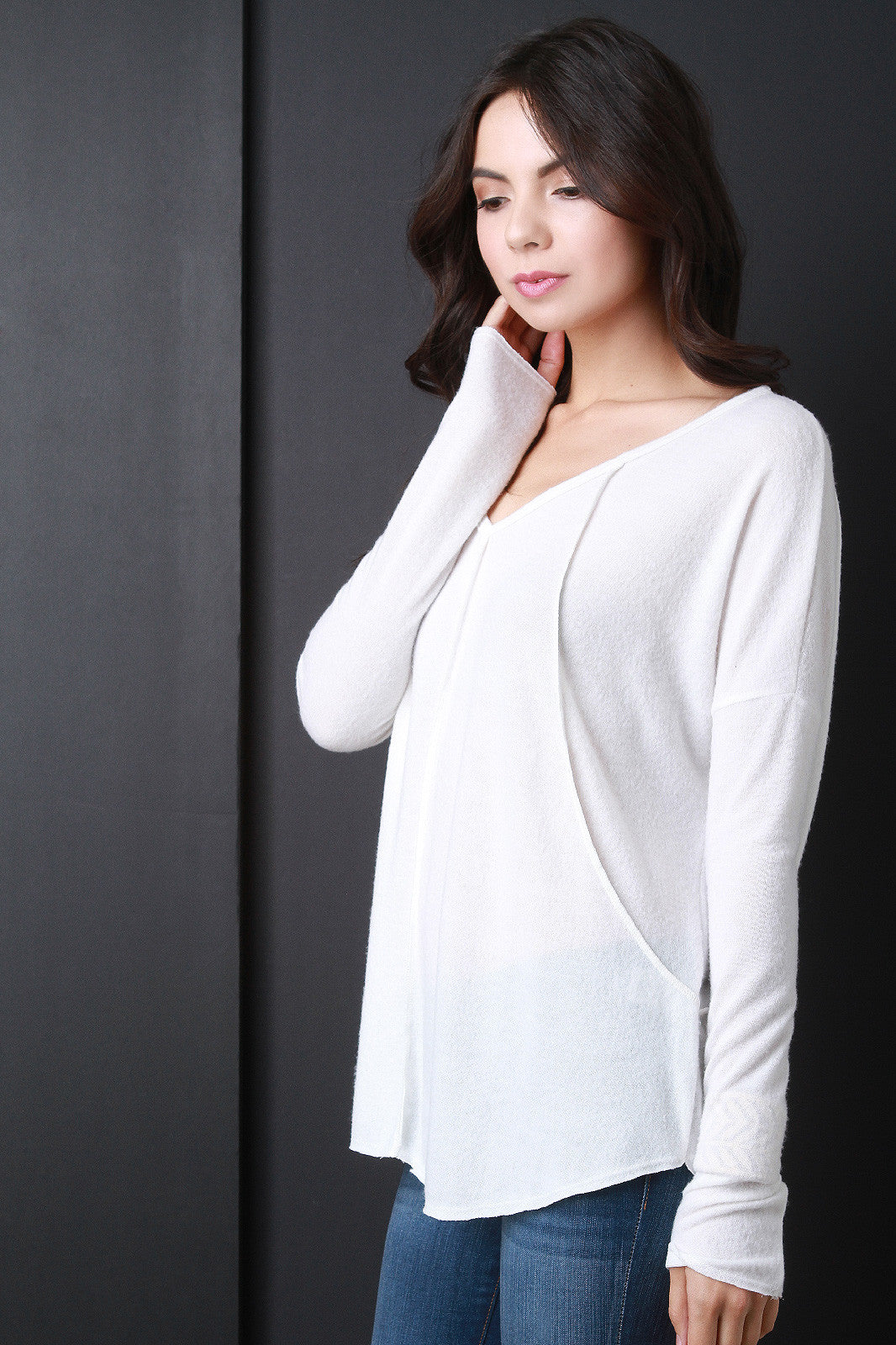 This top features soft knit, v-neckline, serged seams, long sleeves, and slight high-low hemline. Accessories sold separately. Made in U.S.A. 67% Polyester, 29% Rayon, 4% Spandex.