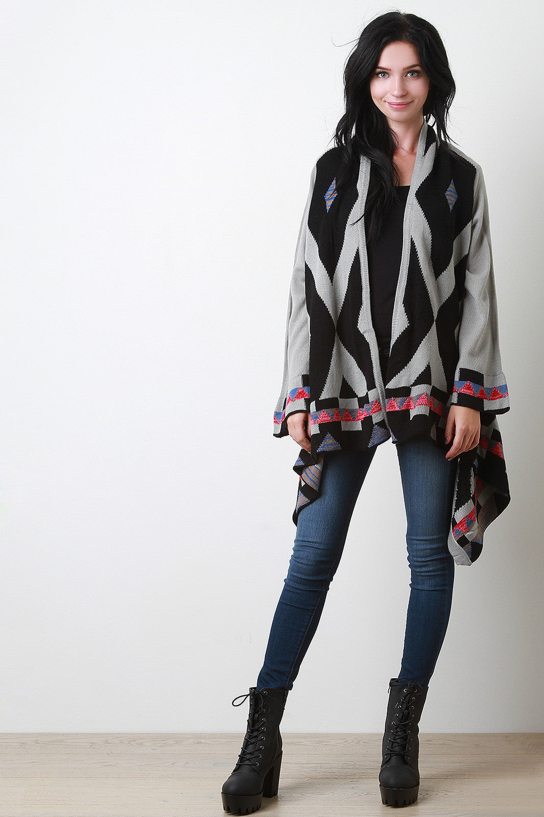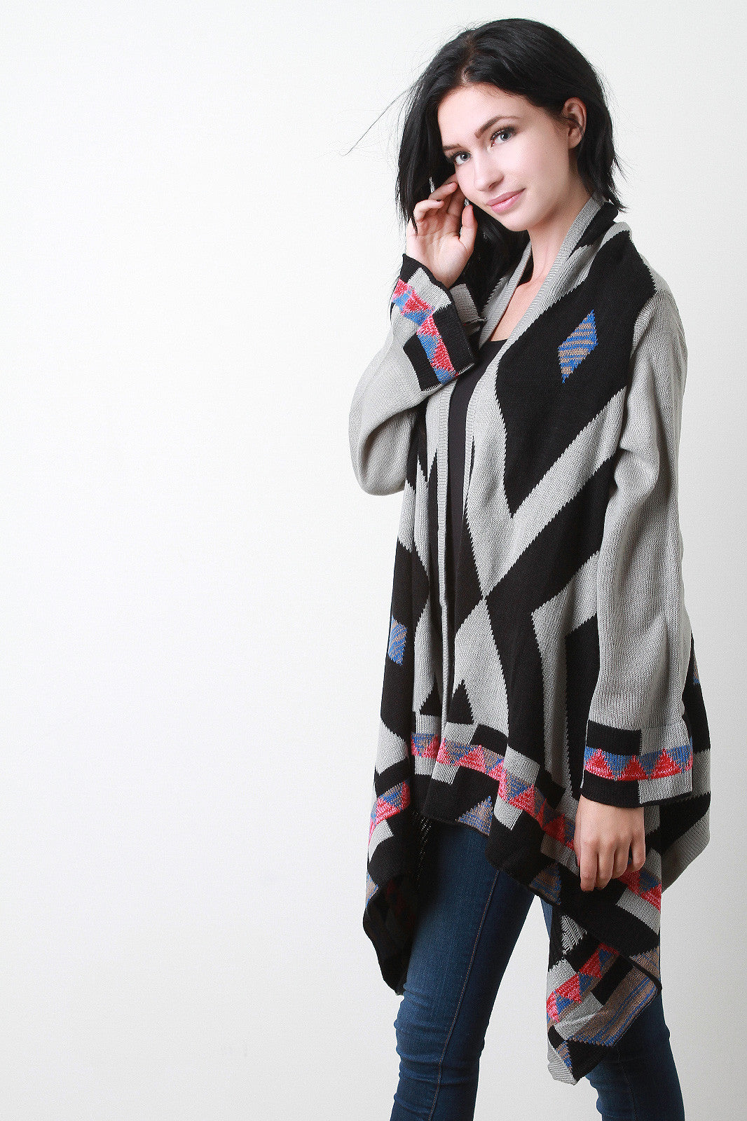 An open front cardigan featuring a diamond knit pattern, long wide sleeves, and a handkerchief hemline. Accessories sold separately. 89% Acrylic, 11% Wool.