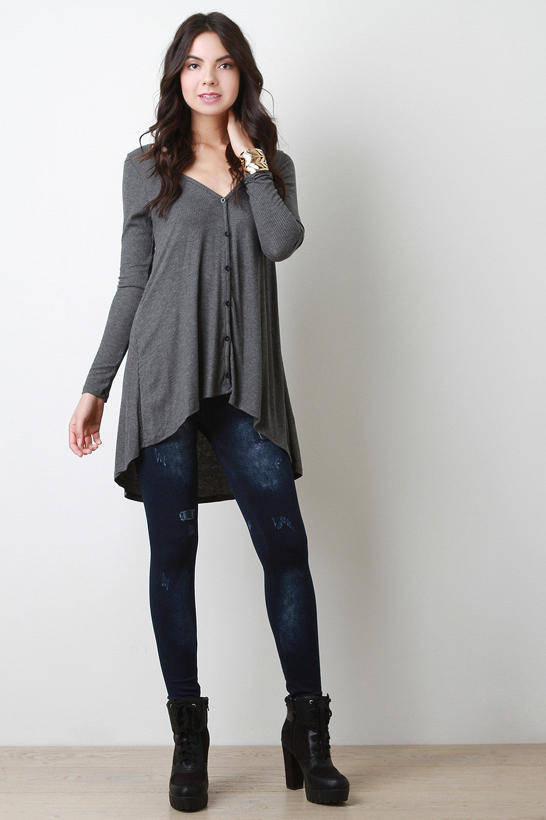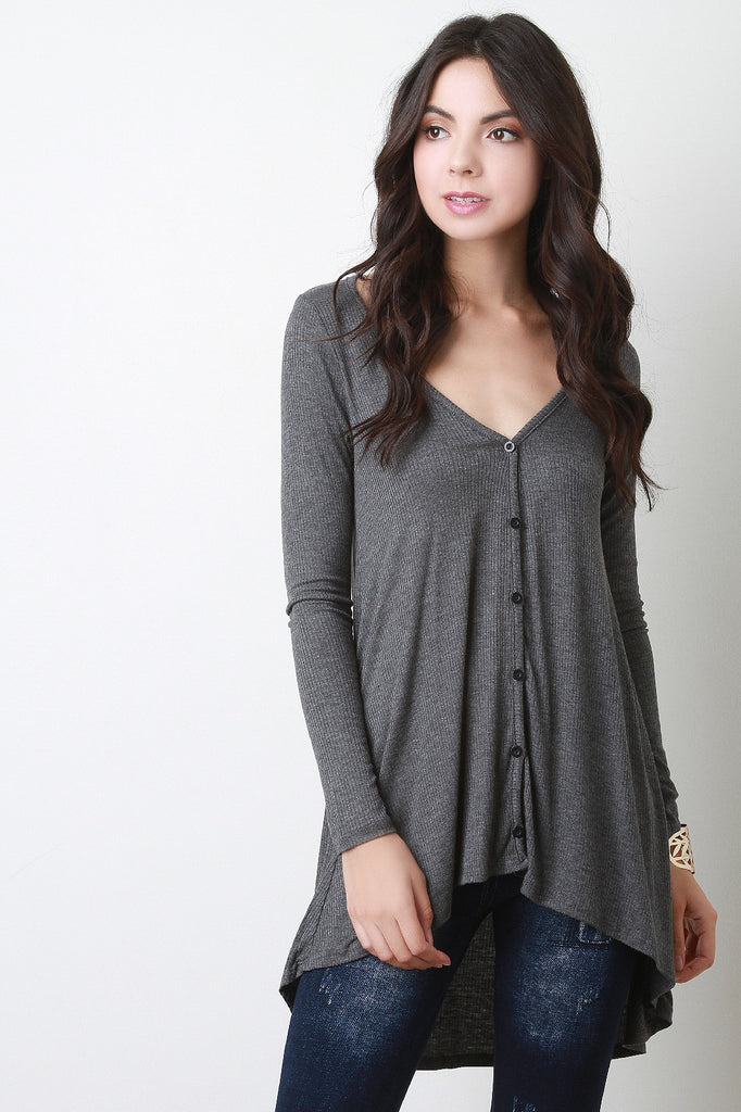 This top features vertical ribbed knit design, button-up front to a v-neckline, long sleeves, and a high low hemline. Accessories sold separately. Made in U.S.A. 96% Rayon, 4% Spandex.