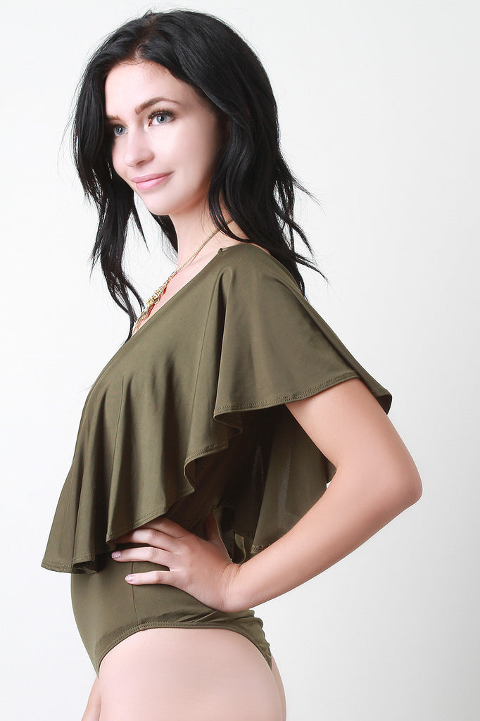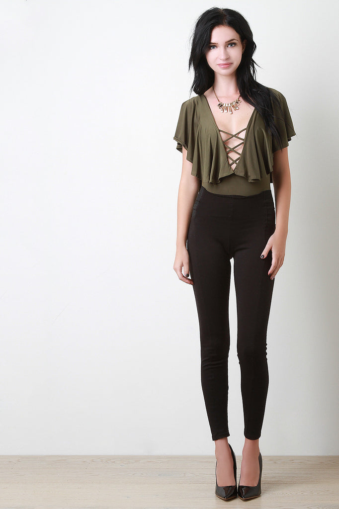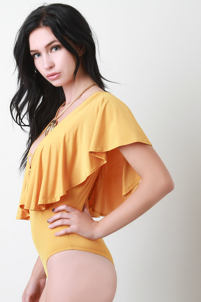 This bodysuit features a plunging v-neckline, crisscross corset cage design, ruffle tier sleeves, thong cut back, and double snap button closure at crotch. Accessories sold separately. Made in U.S.A. 95% Polyester, 5% Spandex.