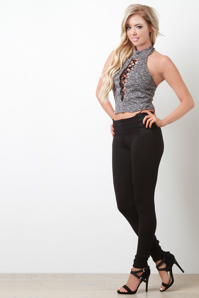 This marled knit top features a mock halter neckline, center cutout design with corset lace up construction. Accessories sold separately. Made in U.S.A. 55% Rayon, 40% Polyester, 5% Spandex.